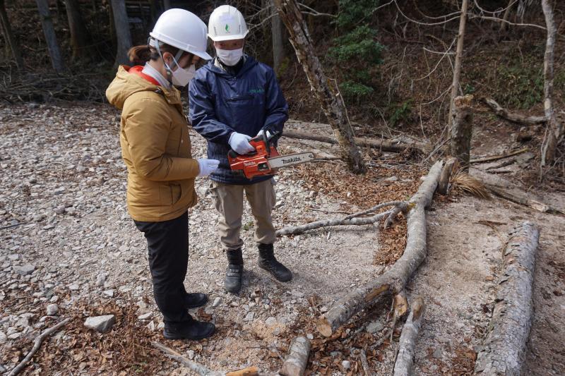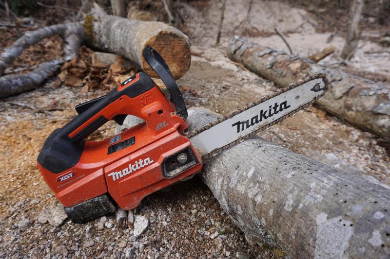 私達スタッフが使用するのは小ぶりのマキタのチェーンソー。バッテリー仕様で音も小さく、女性にも比較的使いやすいです。