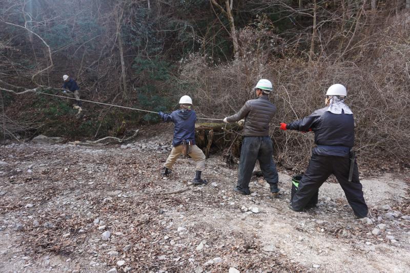 河原で使う丸太橋用に大きな杉の大木を切り出し、加工する作業がメインとなります。