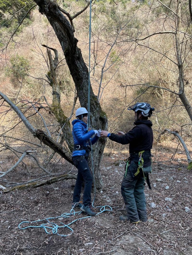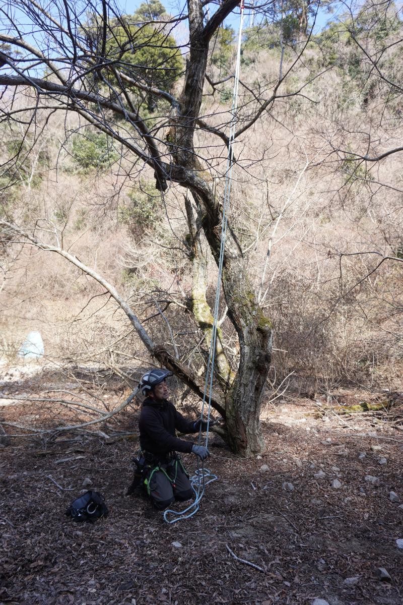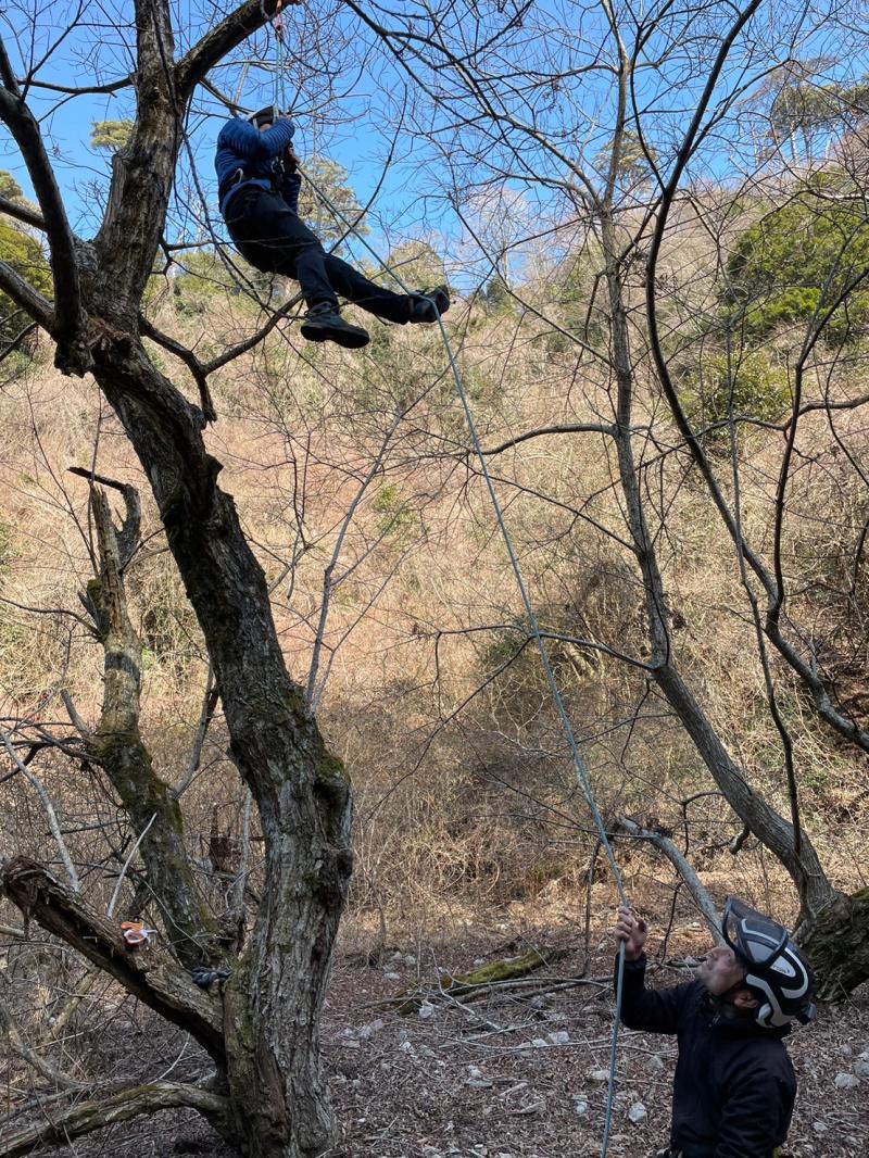 更に特別に、樹木の伐採方法の一つ、②木に登って少しずつ切る作業を体験をさせて頂ける事になりました。イメージはツリークライミングに近いです。まずは7~8m上にまずはロープの支点を作ります。