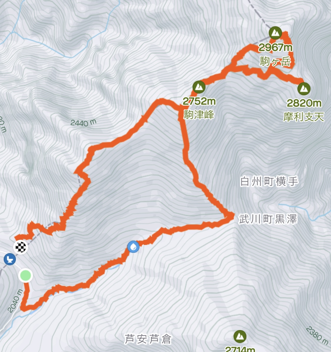 - 北沢峠‐10‐長衛小屋‐23‐仙水小屋‐25‐仙水峠‐55‐駒津峰‐25‐六方石‐40‐甲斐駒ヶ岳‐30‐摩利支天‐35‐六方石‐15‐駒津峰‐35‐双児山‐60‐北沢峠