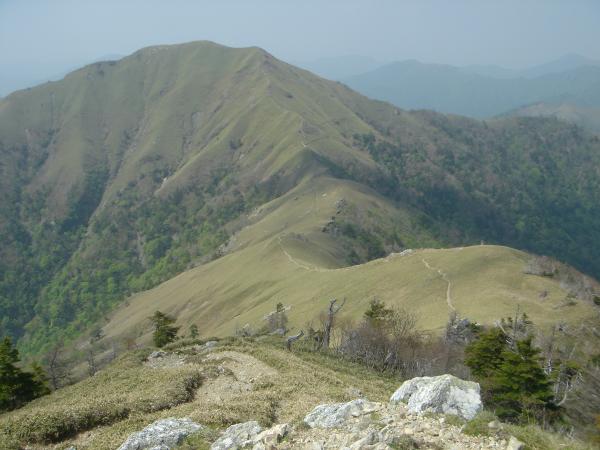 石鎚山山頂の標識がある弥山山頂から痩せ尾根を通過して行きます。