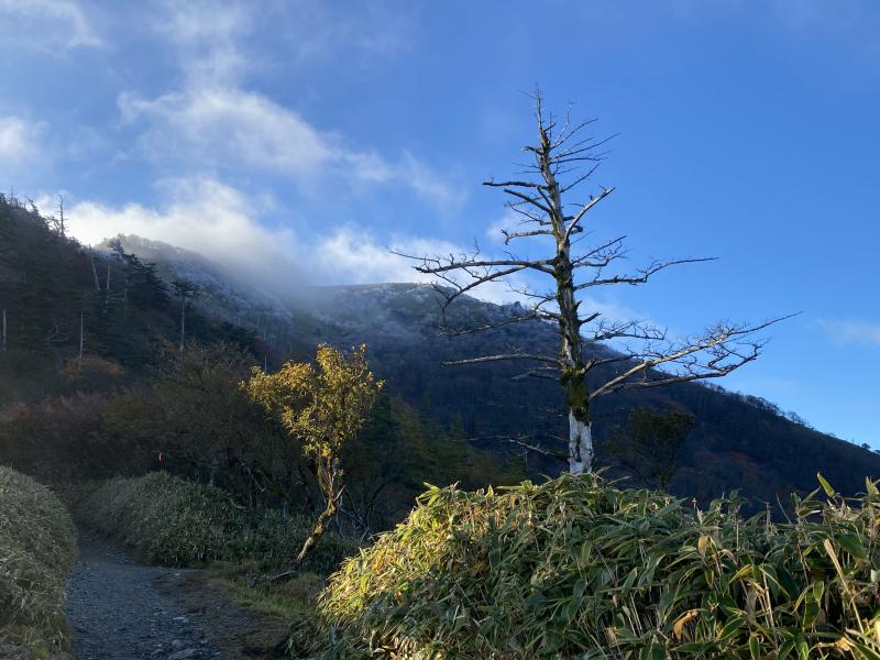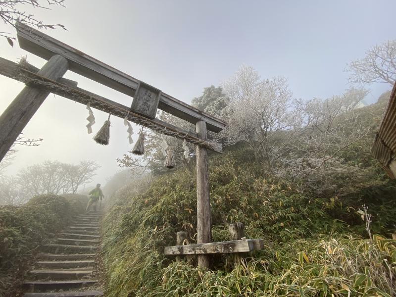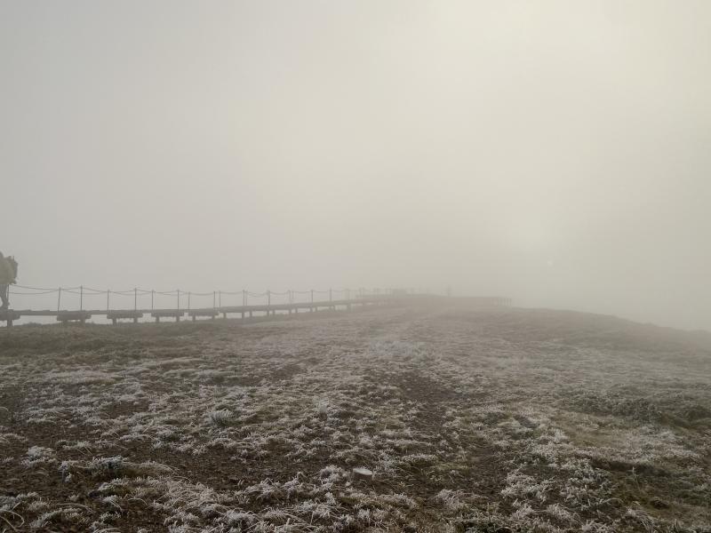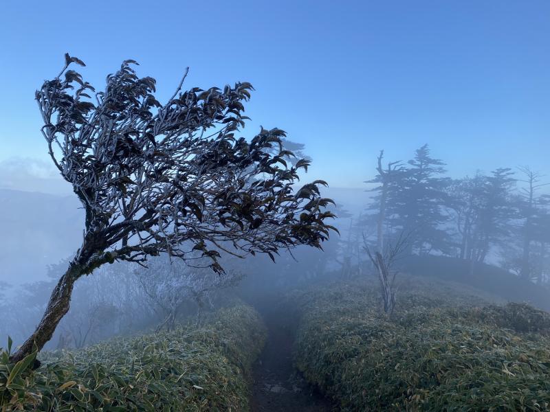 その頃には段々と青空が出てきて、下山途中に山頂を振り返ると霧氷が一面にできていて