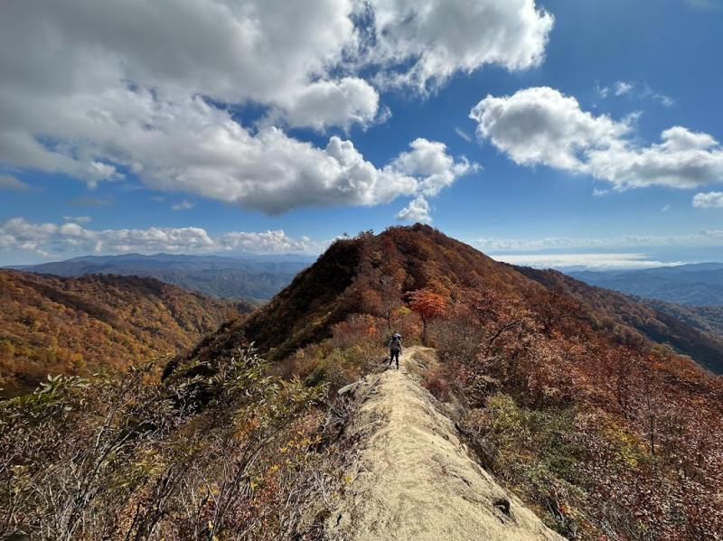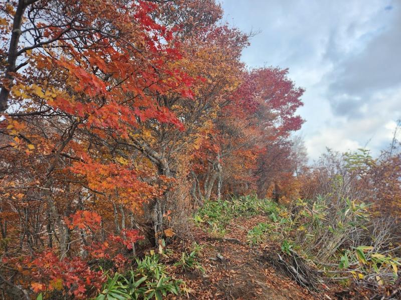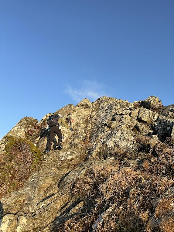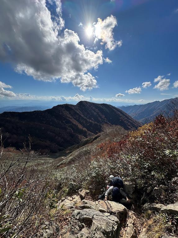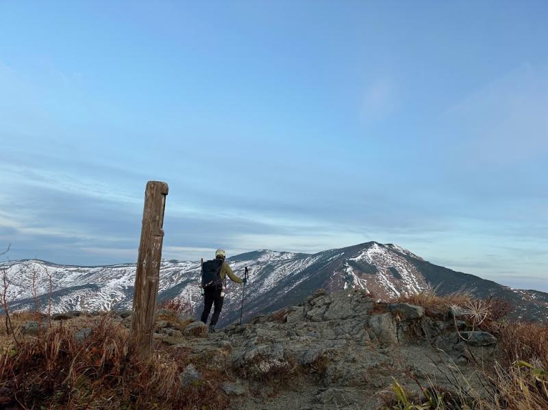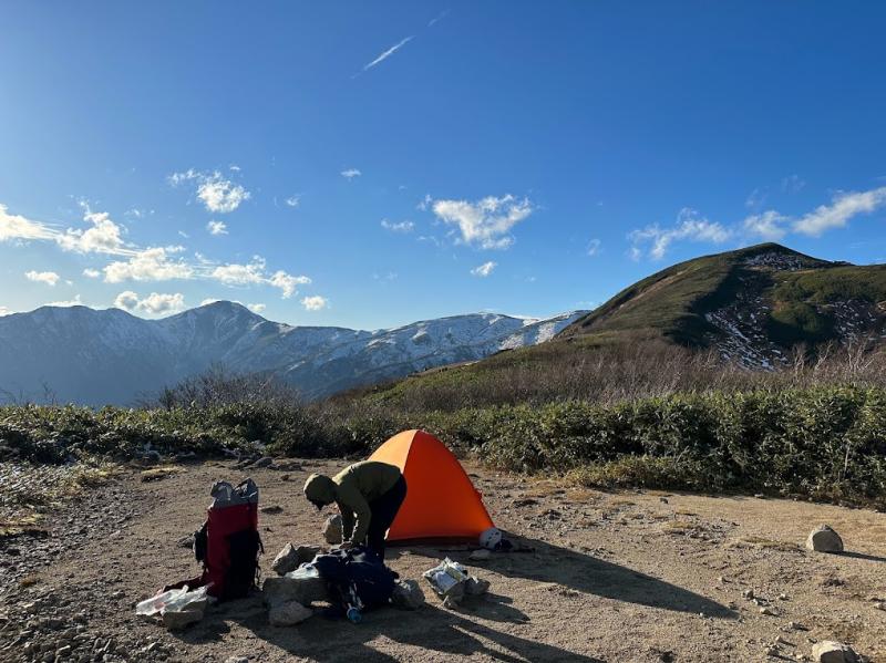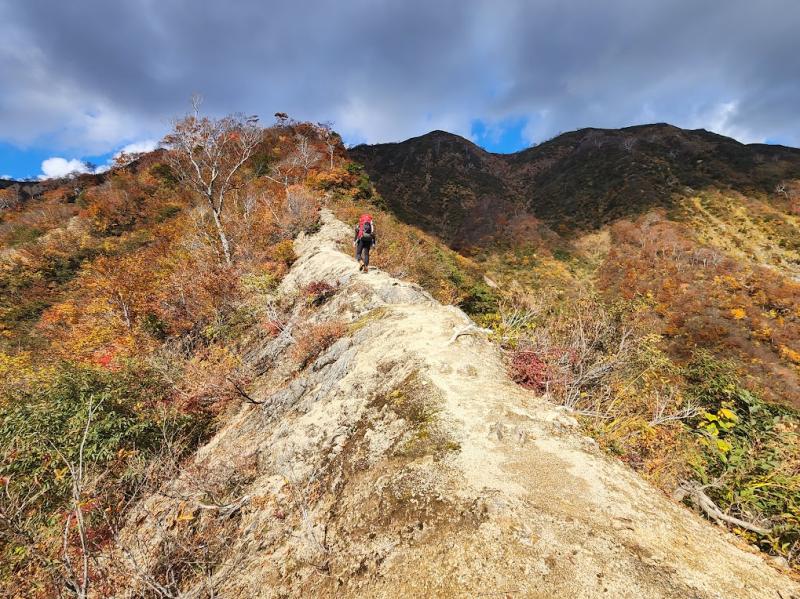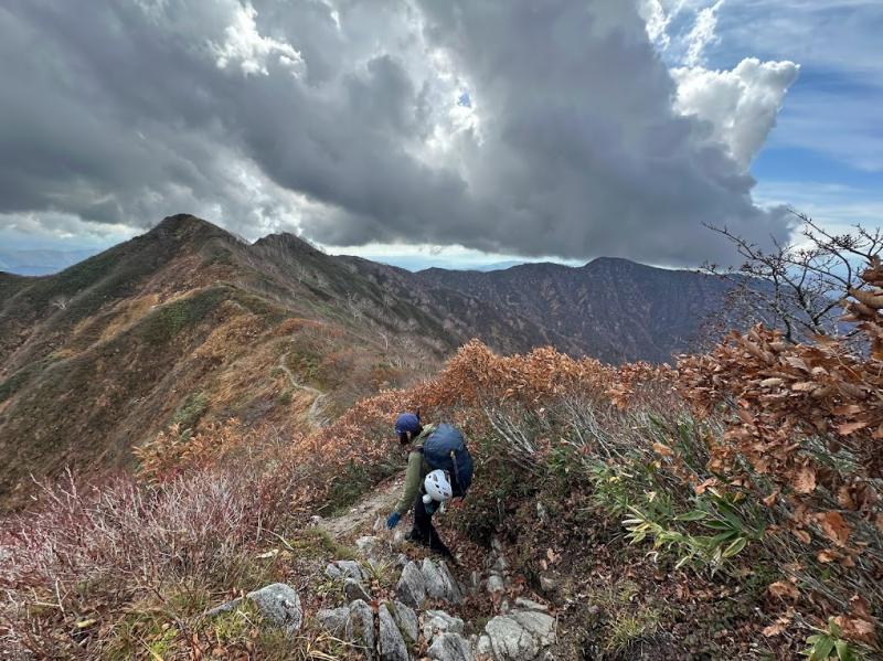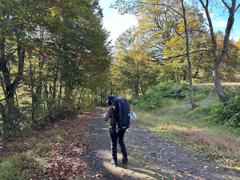 雪が付くと怖いので、今回は岩場の少ない弥平四郎登山口からスタート。狭いガタガタ道を走ること数十分、紅葉が進んだ登山口は明るく、この先どんな絶景が待っているのか初めのうちはワクワクしていました。荷物が少し多いので水は雪をあてにして2Lのみ、テントは持ってもらいちょっぴり楽して登りました。