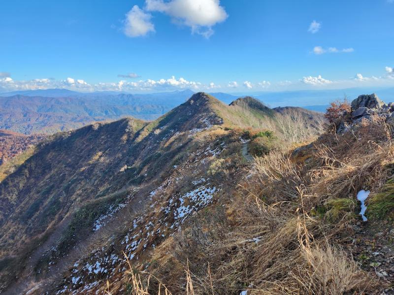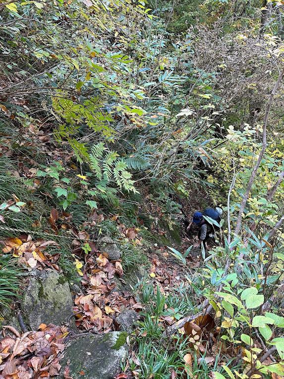 復路もまた狭いへつり。持参したストックをうまく使って何とか転ばないように努めました。疣岩まで戻ったら昨日歩いた道ではなく上ノ越方面へ。露岩はなく危険度は下がりますが、急でとにかく長い道。最後まで楽はさせてもらえませんでした。