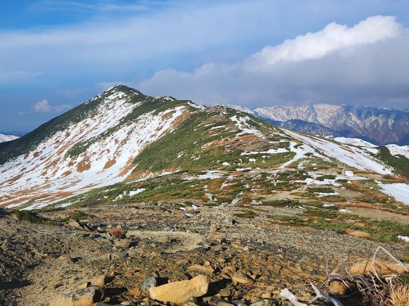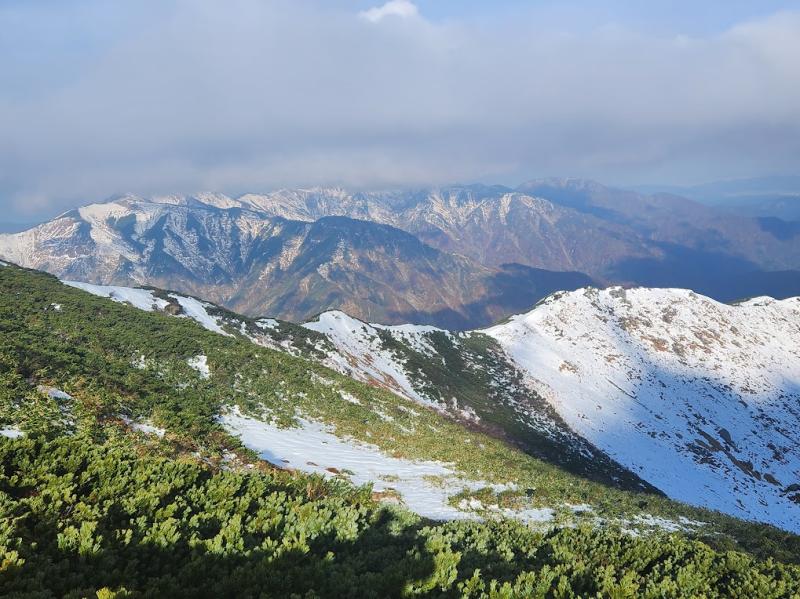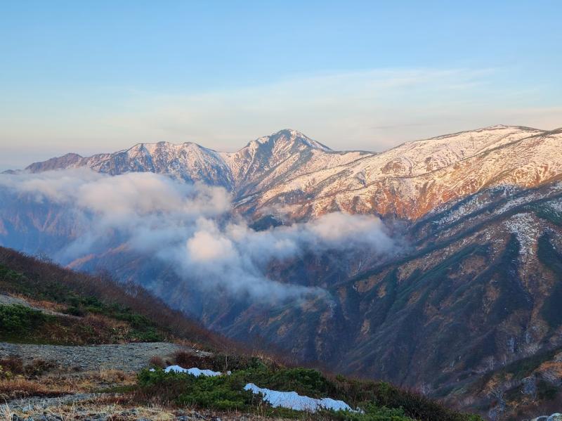 翌朝も穏やかな天気。雪あり、岩場ありの登山道なのでヘルメットを被って出発しました。大好きな山に登れると思うとそわそわしてしまい、ふと立ち止まっては景色や前歩いた時の記憶に浸るという有り様。必要以上に時間をかけて登り、切合に戻った頃はすっかり日が高くなっていました。