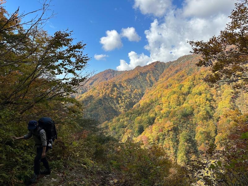 昔お世話になった三国小屋を通り過ぎ、危なっかしいへつりをこなして切合小屋へ。飯豊登山で最も多く利用させてもらった小屋です。シーズンは終了しているのでそんなに人はいないだろうと想像してましたが、紅葉最盛期の秋晴れを狙って来る人は意外にもたくさんいました。