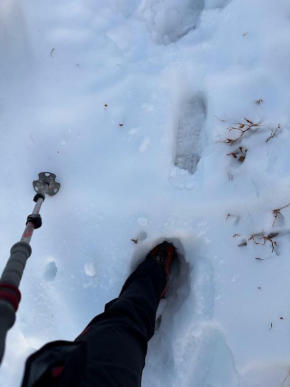 ・積雪は三国小屋を過ぎてから少しずつ出てきました。切合から草履塚で膝まで潜る箇所もあり。アイゼン、ピッケルは使いませんでしたがゲイターは装備しました。