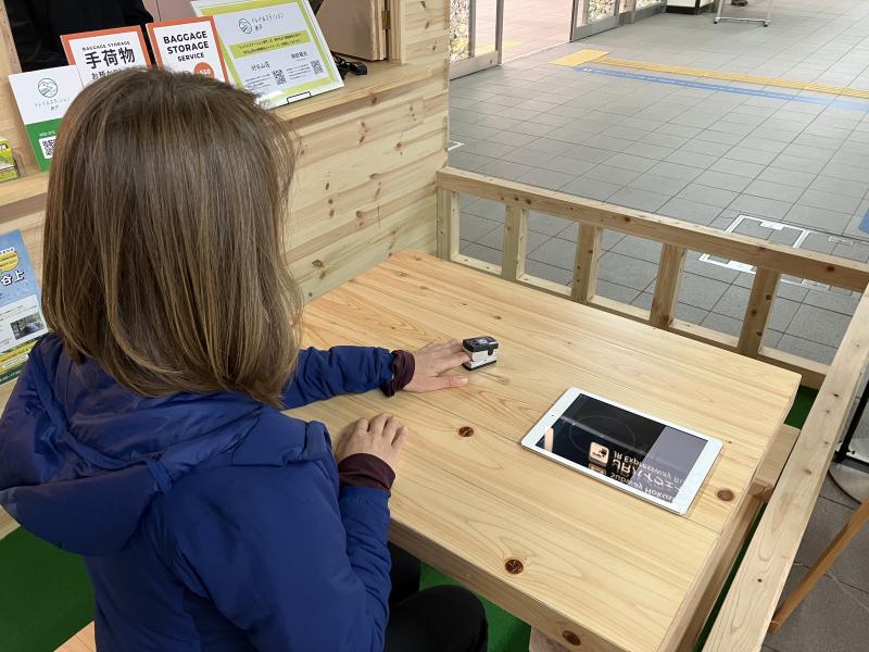 まずは登山前の皆さまの状態をチェックするために、指から専門の装置を使って1分間計測。交感神経、副交感神経、脈拍数などから、心身のストレス度合い、血管年齢などの数値を測りました。