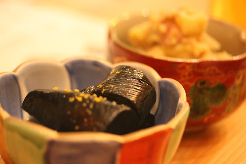 茄子の煮びたしもゆずが香り、サツマイモのサラダはマイタケ入りです。