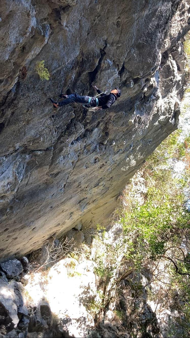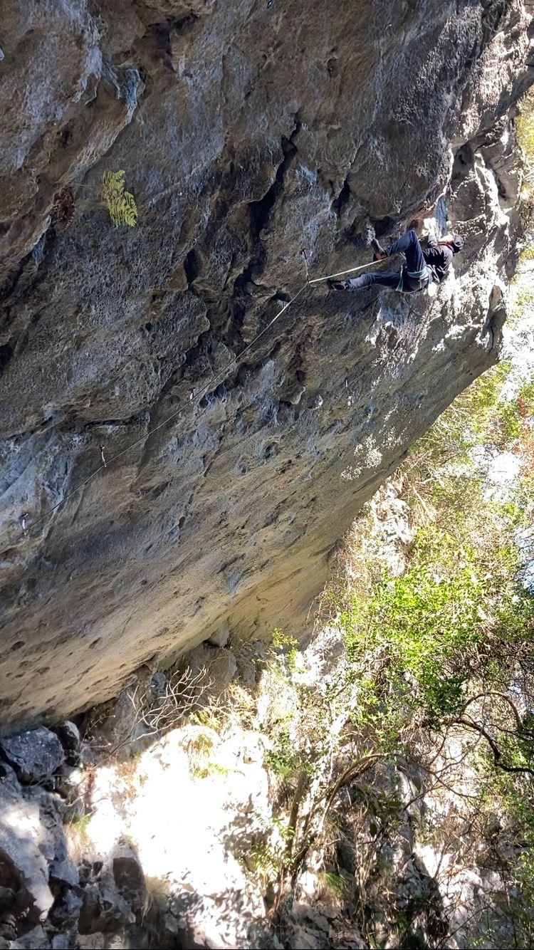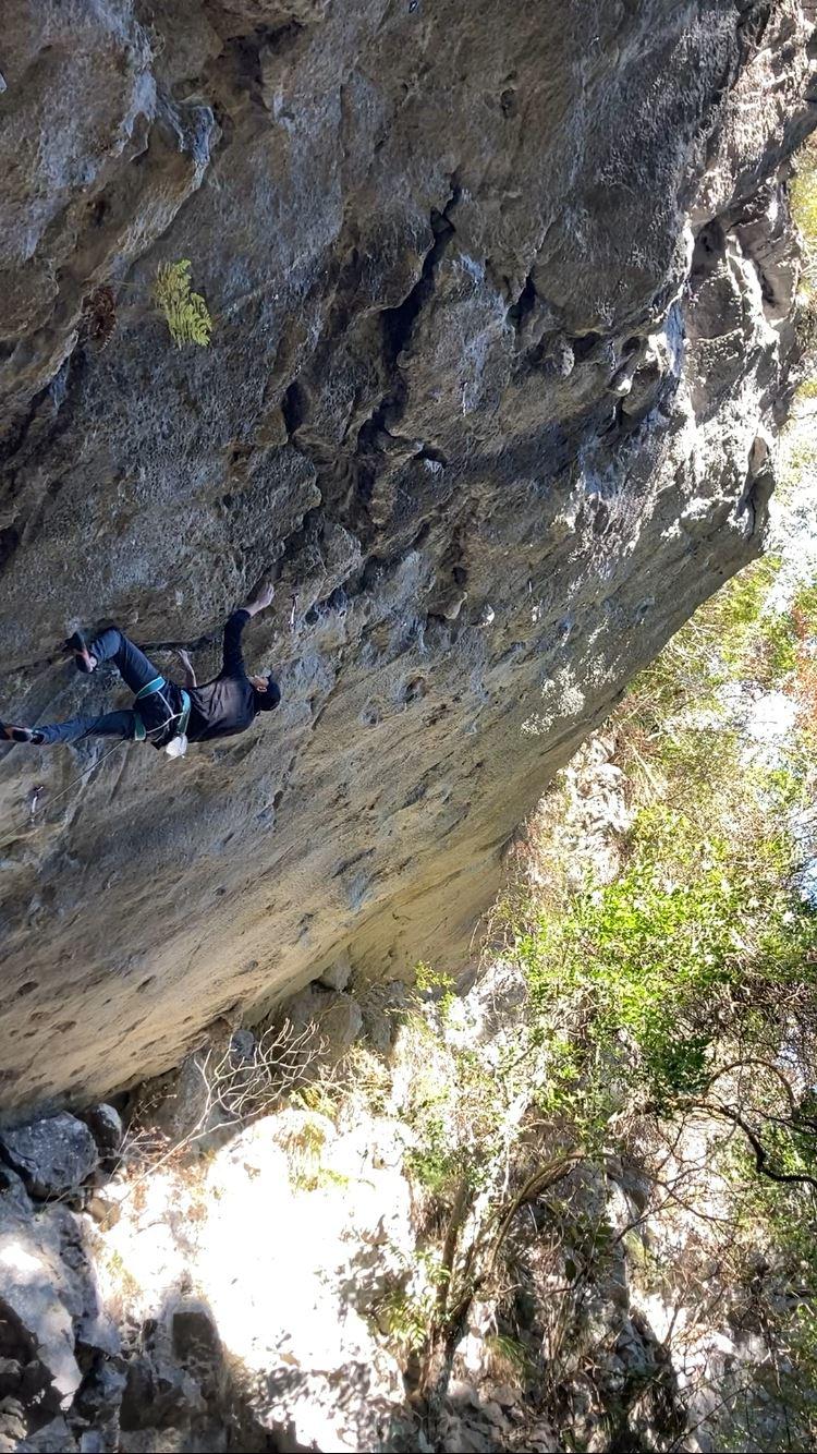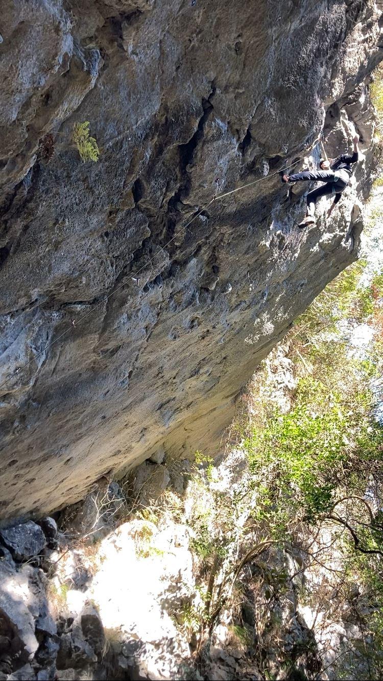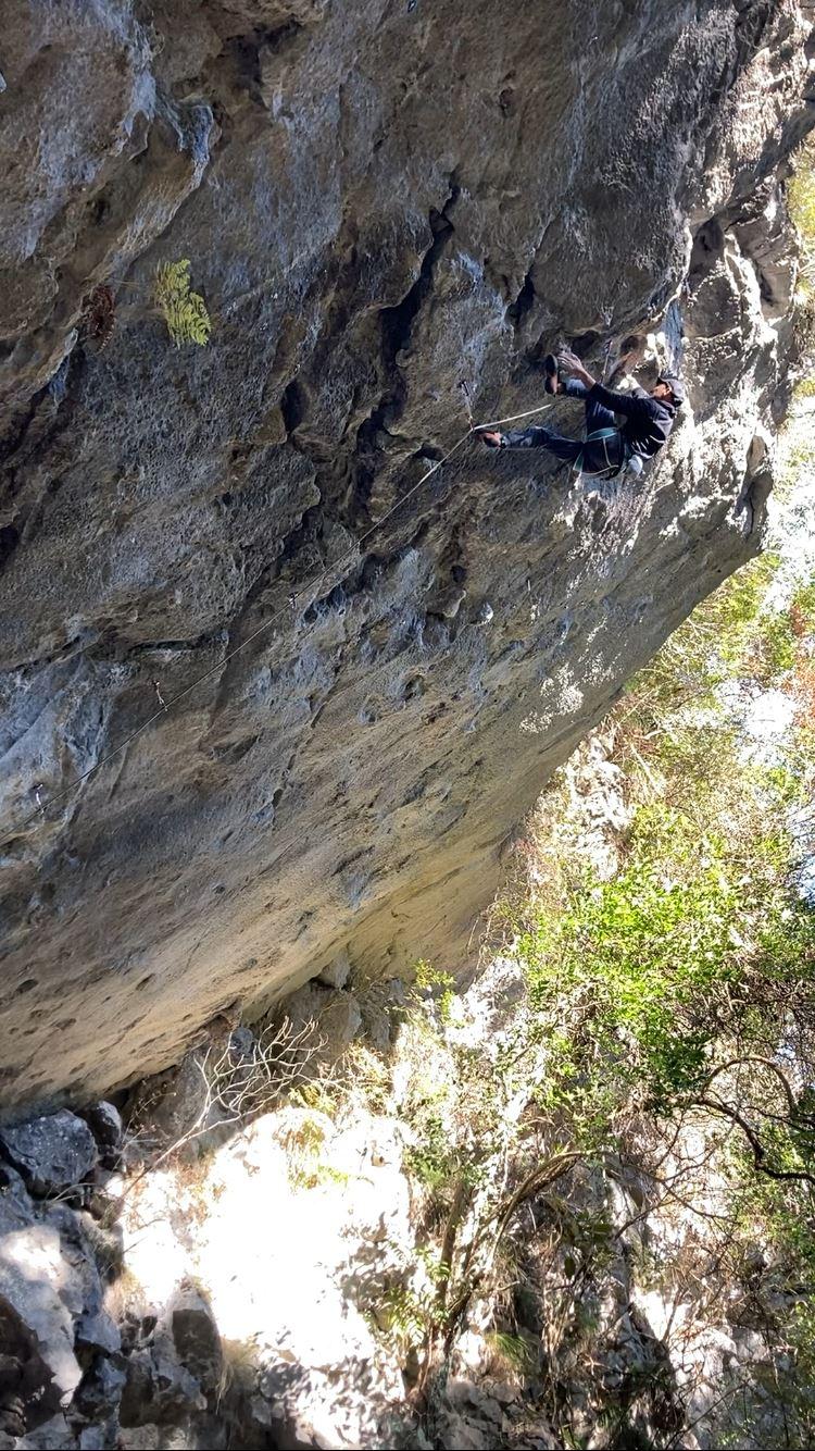 岩質は石灰岩。当日は3日ほど晴れが続いた後だったので染み出しはなかったですが、雨の後1~2日は『リョーマ』のあたりが染み出しが一番酷くなります。