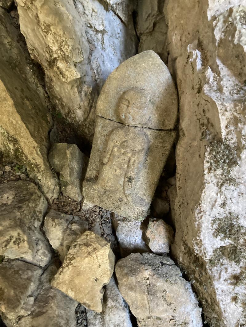 首切り地蔵エリアの岩壁は車道からもうっすら見えていて、踏み跡に入り込んで1分ほどで取りつきですので、アプローチシューズでなくても問題ありません。