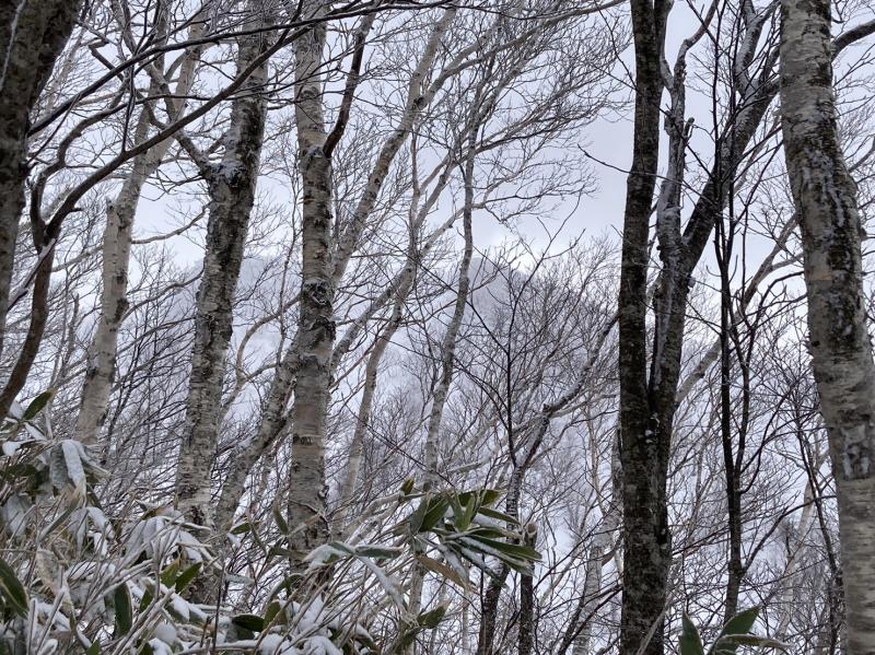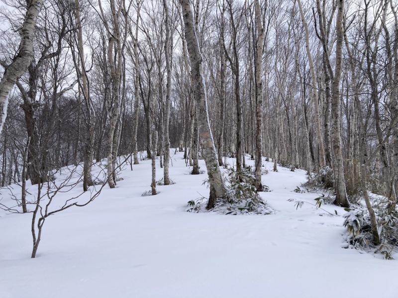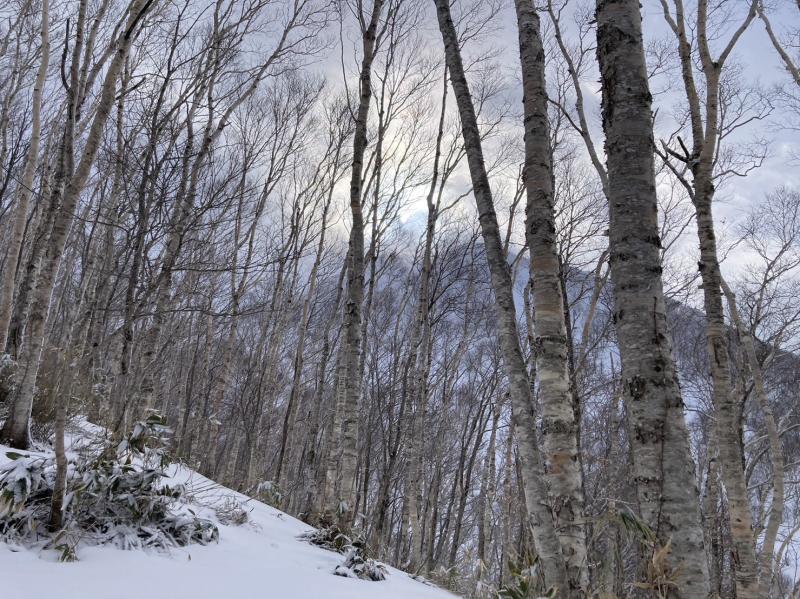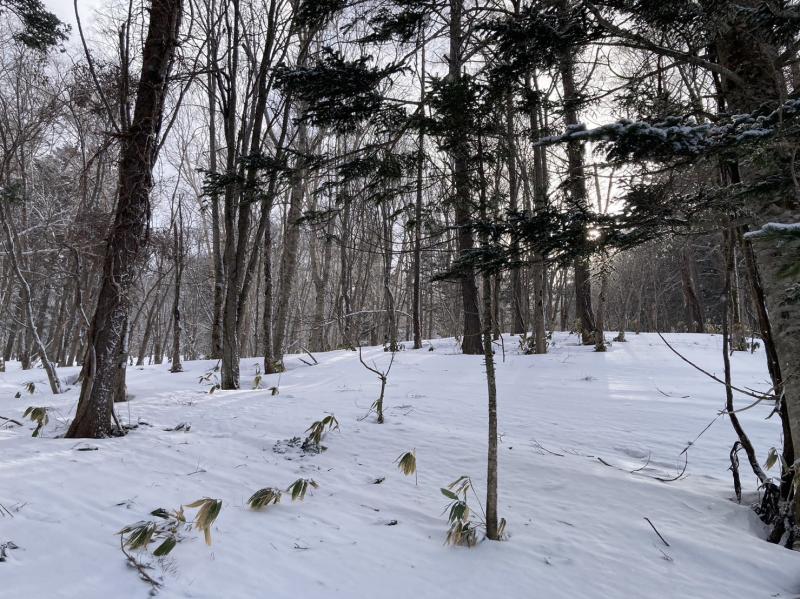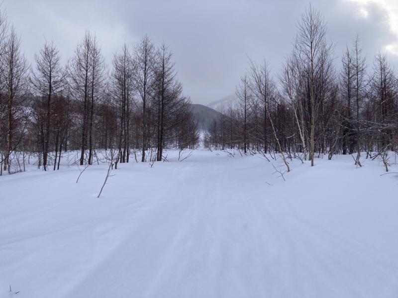 1km程、ほぼ平らな雪原を歩いてから山に入ります。