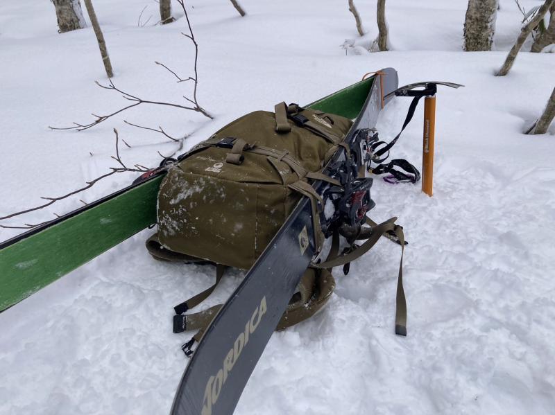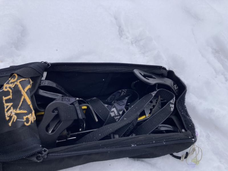 バックパックの中にスキーブーツ用のワンタッチアイゼンではなく、