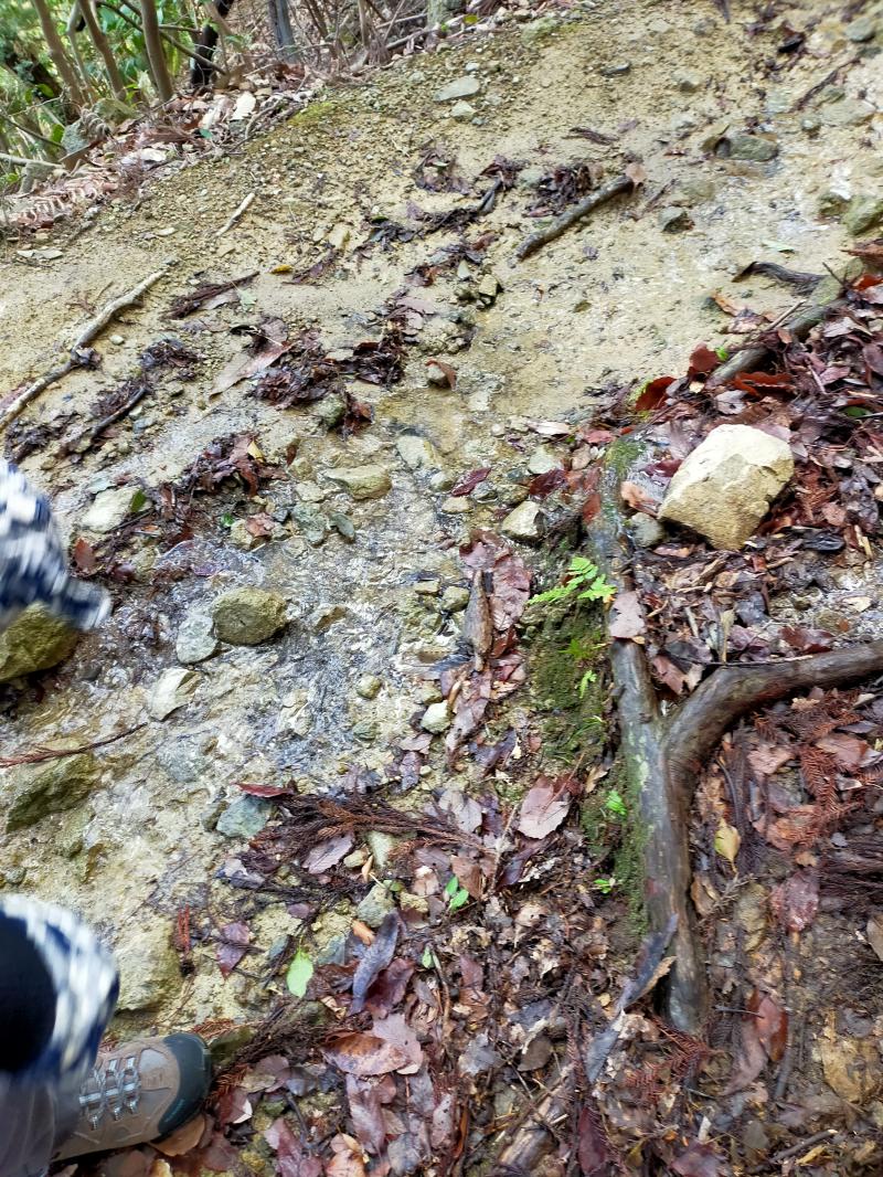 - 昨日までの連日の雨で、登山道に水が流れていました。もともとの沢も、前回に比べて水量が多く、渡るのが少し大変でした。