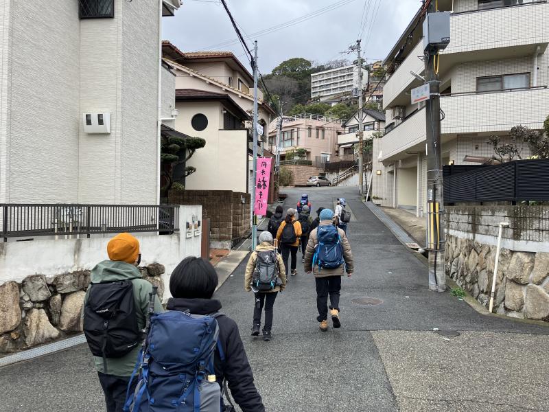 - 岡本駅(10)岡本公園(15)登山口(60)七兵衛山(50)金鳥山(50)保久良梅林(10)保久良神社