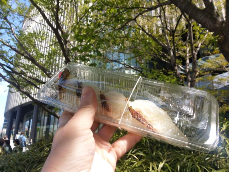 須磨駅そばの赤門 大路屋の魚屋さんに丁度握りが並び「焼き明石鯛」の握りなんと420円で手に入れ、グランフトント大阪の大島桜(基本野生種)の桜前にて花見朝食いただきました。