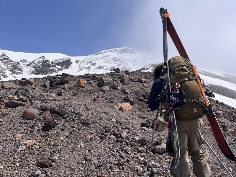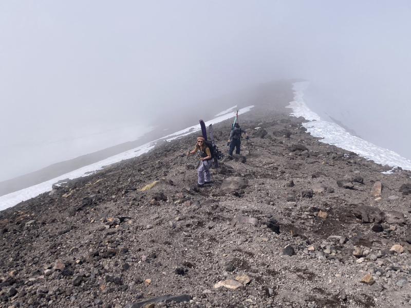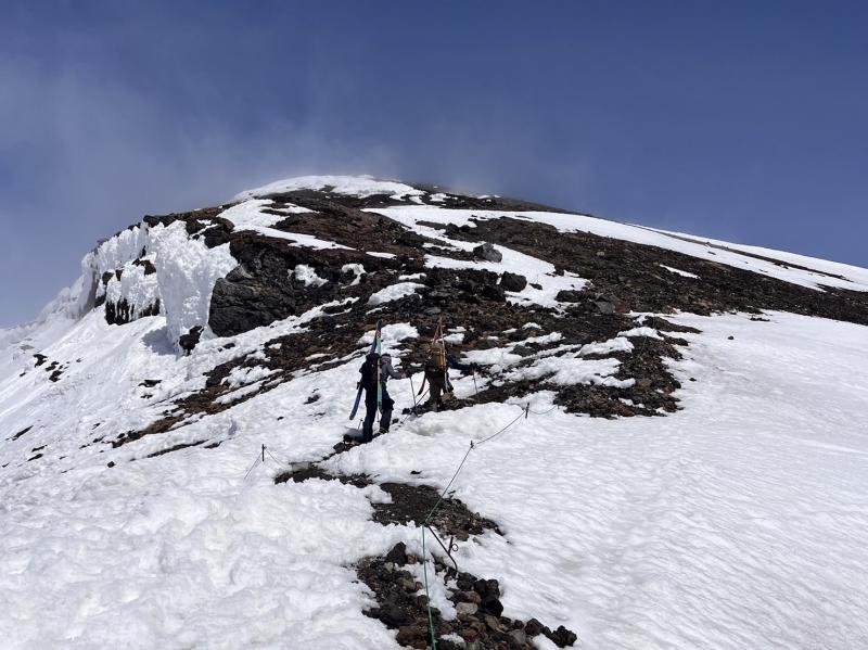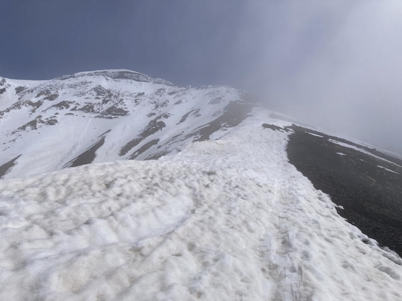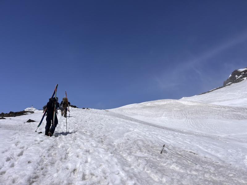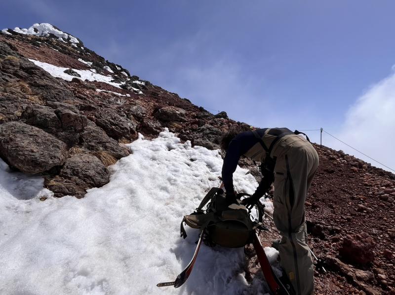 標高1900m付近から板を脱ぎ雪のなくなった登山道を登行。