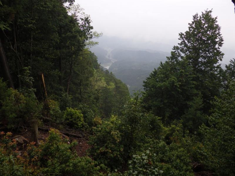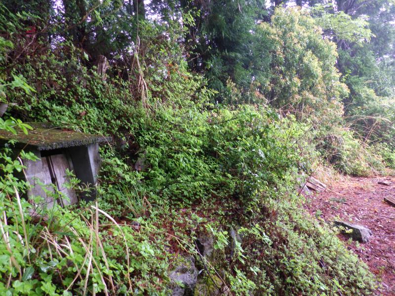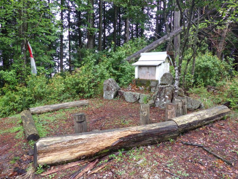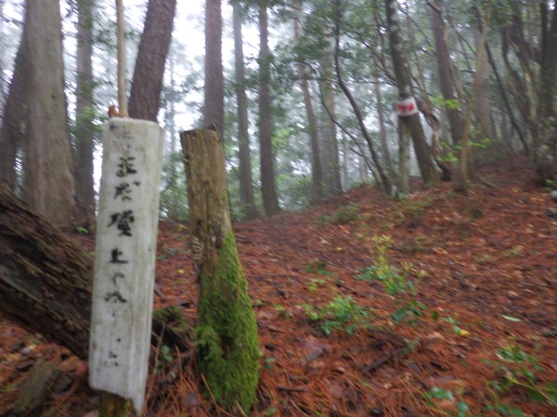 稜線に上がると、急坂が待っていて、グネグネ道だが、傾斜はあります。踏ん張って登ると、国旗が立つ山頂に着きます。なぜ国旗なのかわかりませんが、山頂なのがすぐにわかります。祠の後ろに控えめに二等三角点があります。ここからの展望は下の集落と近くの納古山が見えるらしいですが、曇って集落のみ。また山頂の向こう側の展望所では晴れていれば、御嶽山や恵那山が見えるらしいですが、こちらも全くガスの中で残念。