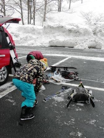 順調に進んでいましたが、偽ピーク(本当は 『深入山の肩』 と言うそうです。)手前で雪崩がおこっており先発していたグループの方々と"今日は山頂は無理だね。"と言う事で、スキーに履き替えピューっと駐車場に到着♪