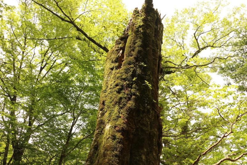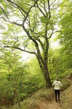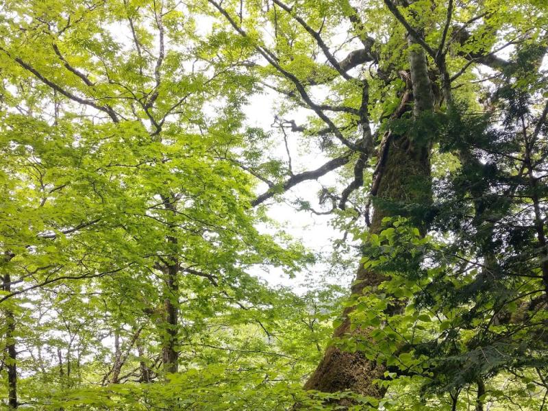 ブナとオオイタヤカエデの樹齢100年は超える森、朝天気図が変わり晴れ間が出ており新緑が素晴らしいものでした。
