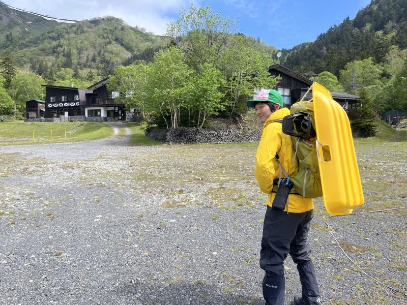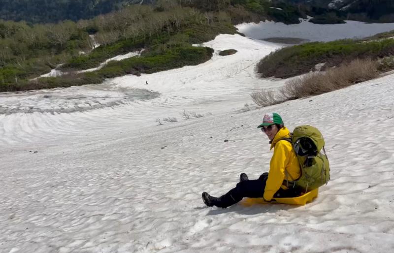 一緒に行ったメンバーは、スキー・スノーボードで斜面を滑走したり、沼をウォータースライダーする予定だったので、わたしは「そり」をザックにくくりつけて参加しました。