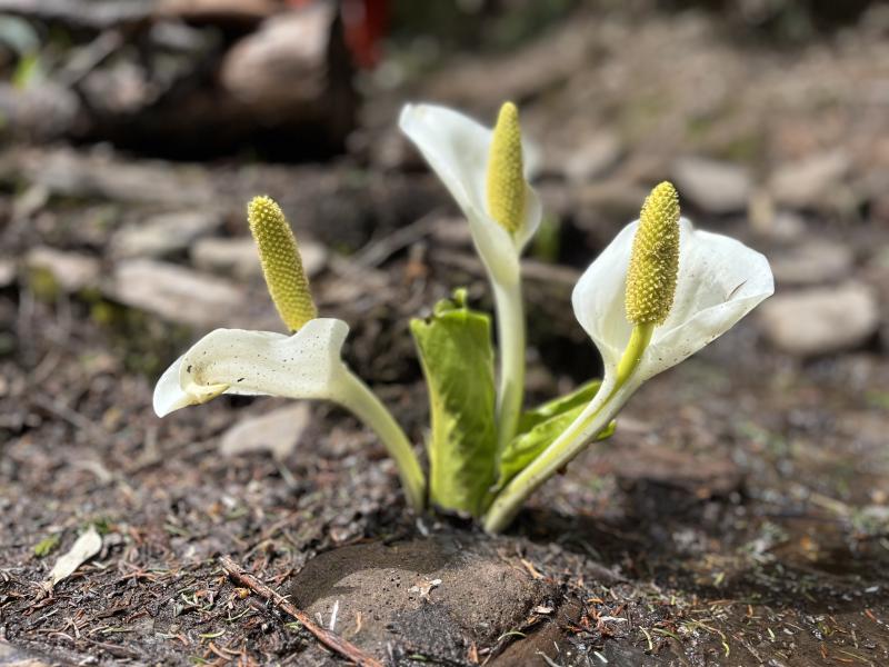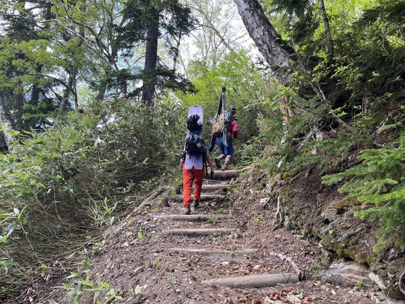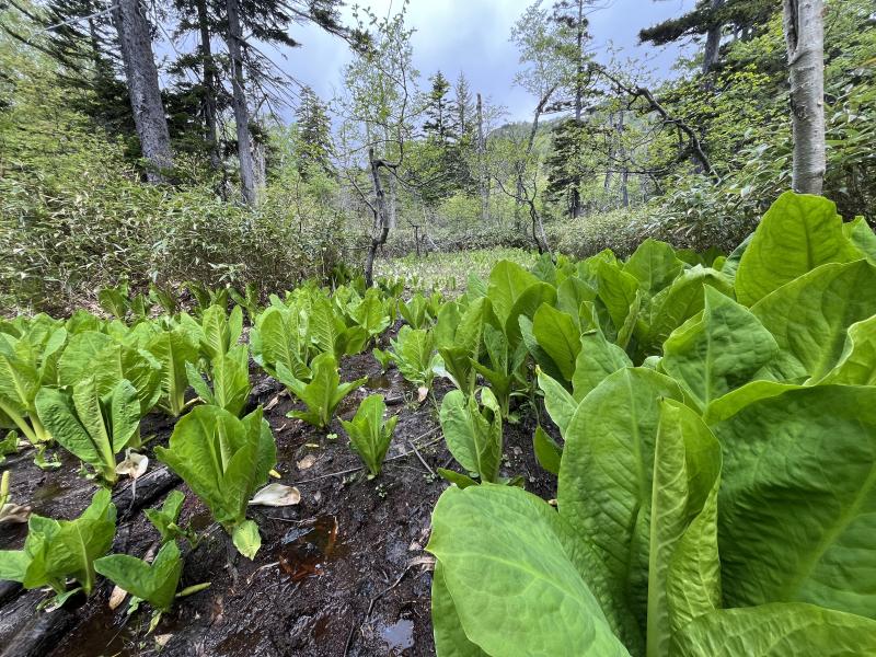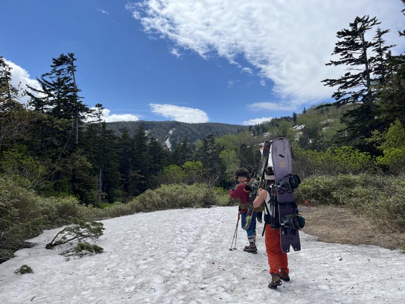 沼めぐりコースの登山道を2時間ほど、ミズバショウの群生や、地上から吹き上がる湯煙、個性豊かな沼たちなど、見どころ満載のアプローチを経て、雪が多く残る標高の高い斜面までハイキングを楽しみました。