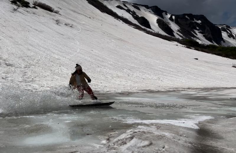 かろうじて遊べそうな水溜りと、それに続く雪面を発見したので、メンバー各々トライして遊びました。
