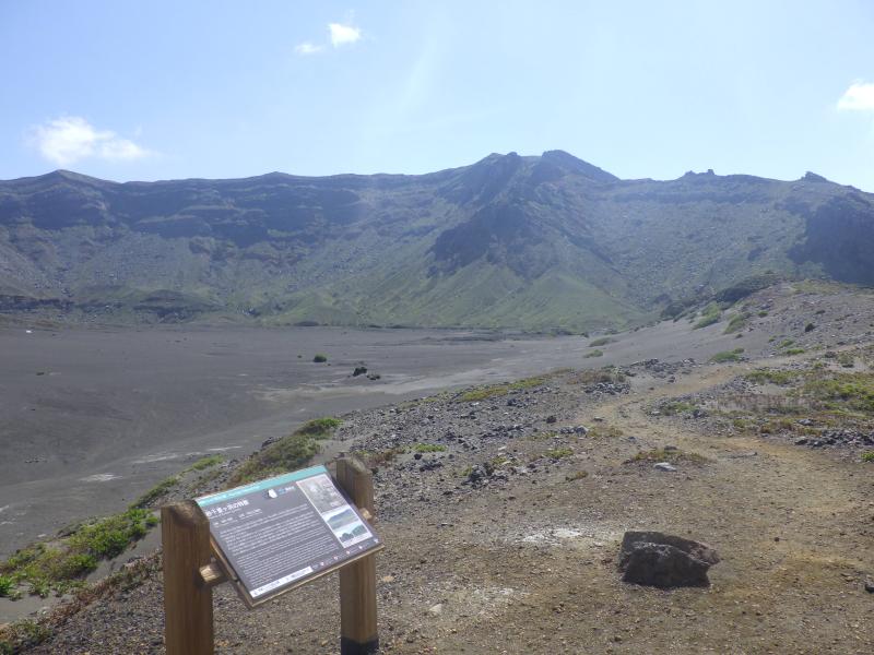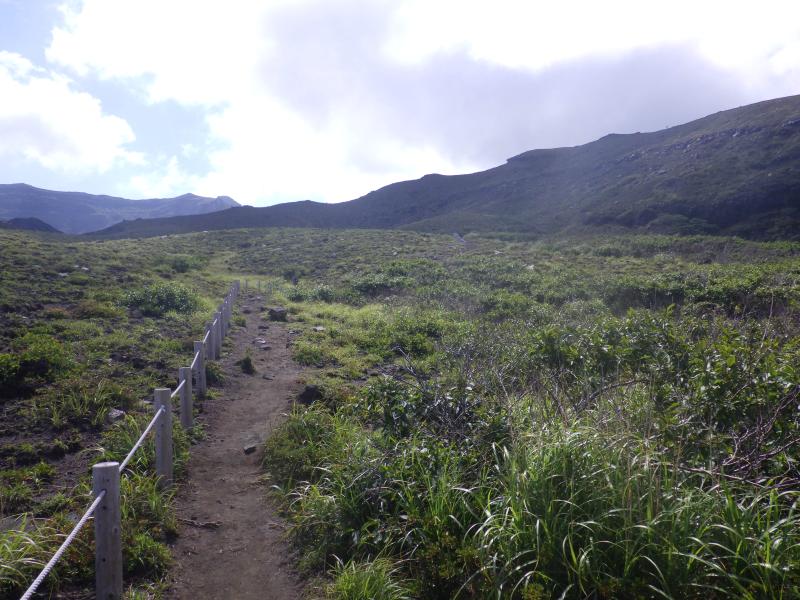 現在は噴火警戒レベル2(中岳火口から概ね1kmの範囲内の立ち入りは禁止)は発令中で昨日とは逆方向の砂千里迂回ルートで高岳中岳に登ります。仙酔峡と違って、こちらは警備員が配置され、登山口と迂回ルート入口で誘導してます。砂千里には入れないので、右手のミヤマキリシマの低い樹木の中を通り、皿山の肩経由で登山道はつけられています。