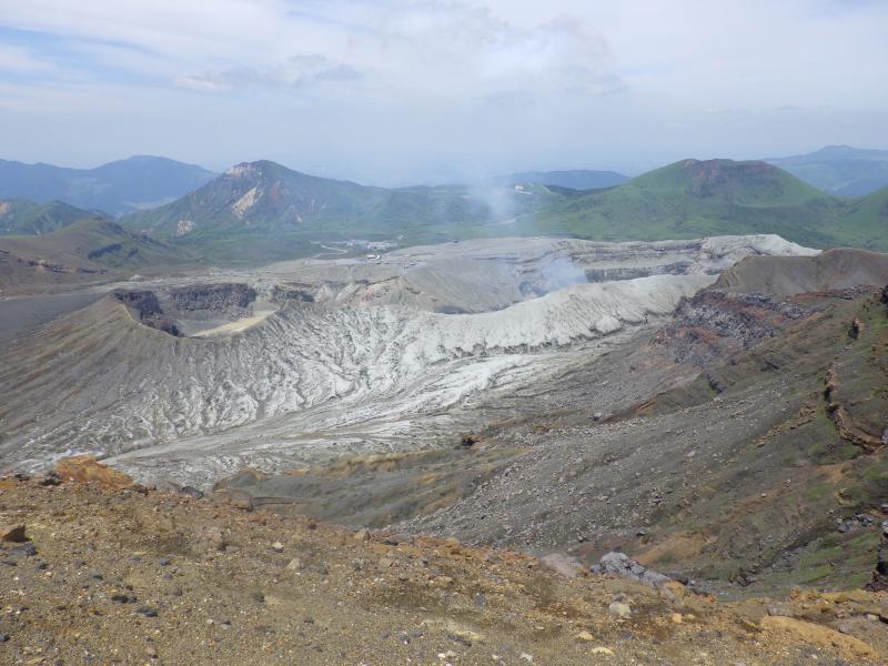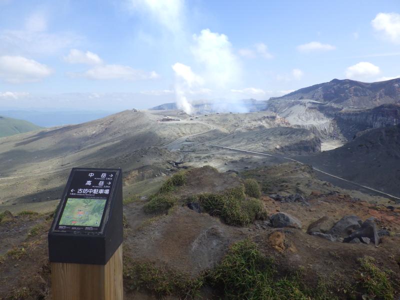 砂千里は上から見下ろす形ですが、植物も生えない火山灰の砂地が覆った真っ白の台地で遠くに火口が見え隠れします。火口からは噴煙が上がっていて、まさに活火山です。