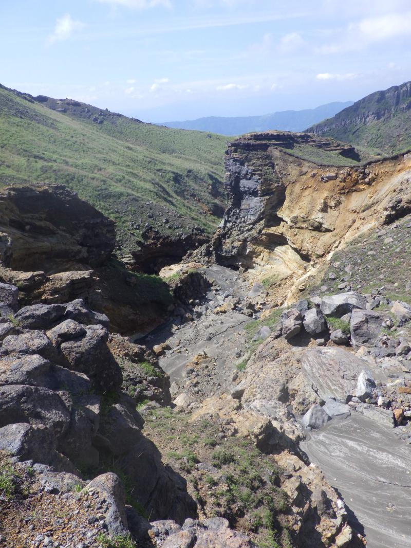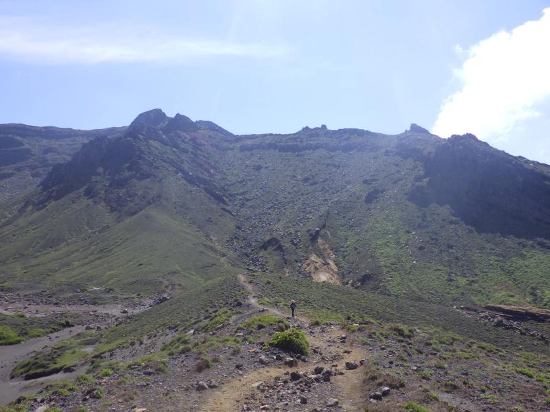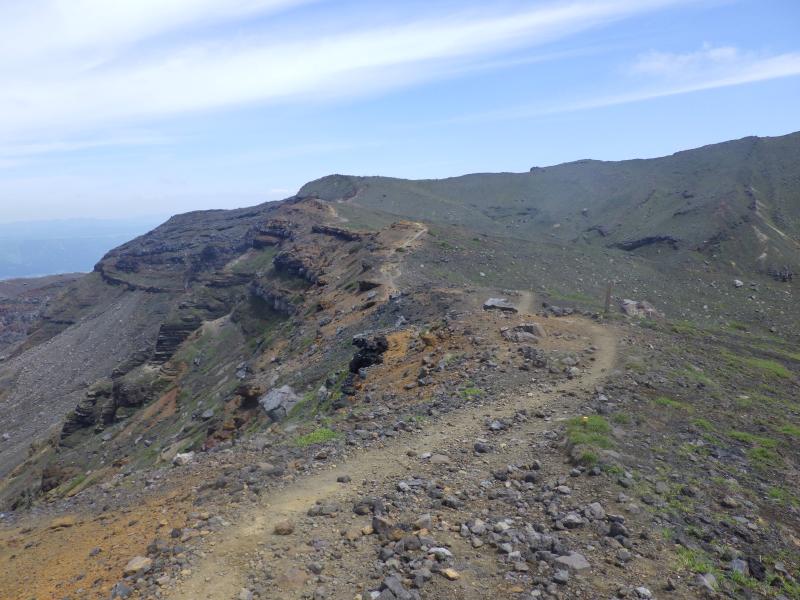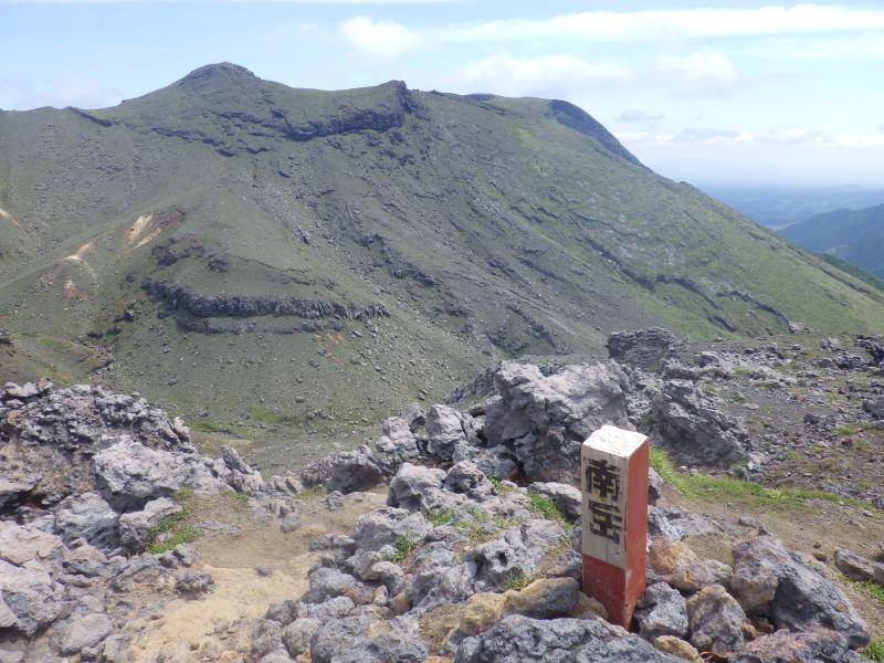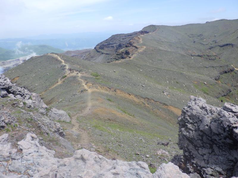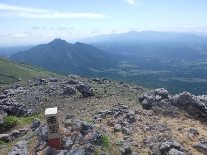 砂千里の端の方ではグランドキャニオンのように荒々しい岩の隙間を谷が一気に下降していて、登山道はそれを見下ろすように今度は南岳への登りにさしかかります。火山岩のゴツゴツした登山道を上がって行きますが、昨日の仙酔尾根に比べると、それほど急ではなく、どんどん高度を上げていきます。南岳の稜線まで来ると、向こうに根子岳の展望が広がります。ここから中岳まではきれいなスカイラインが走っていて、傾斜も緩く、楽々と中岳へ進みます。2日連続で中岳へ来ましたが、今日は風もあまりなく、暑いです。