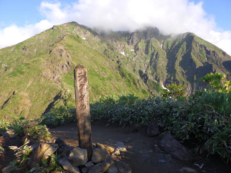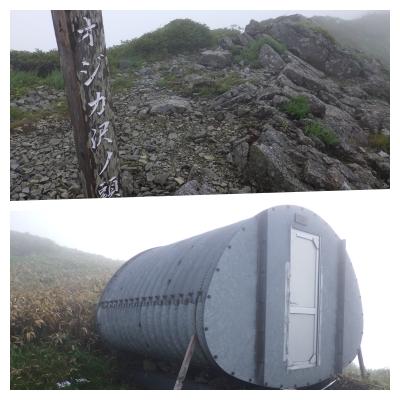 周辺はガスの為、展望は良くなく、風も強いので寒いくらいです。一瞬、オキの耳が見えたのですかさず、画像に納め、肩の小屋で一休みします。