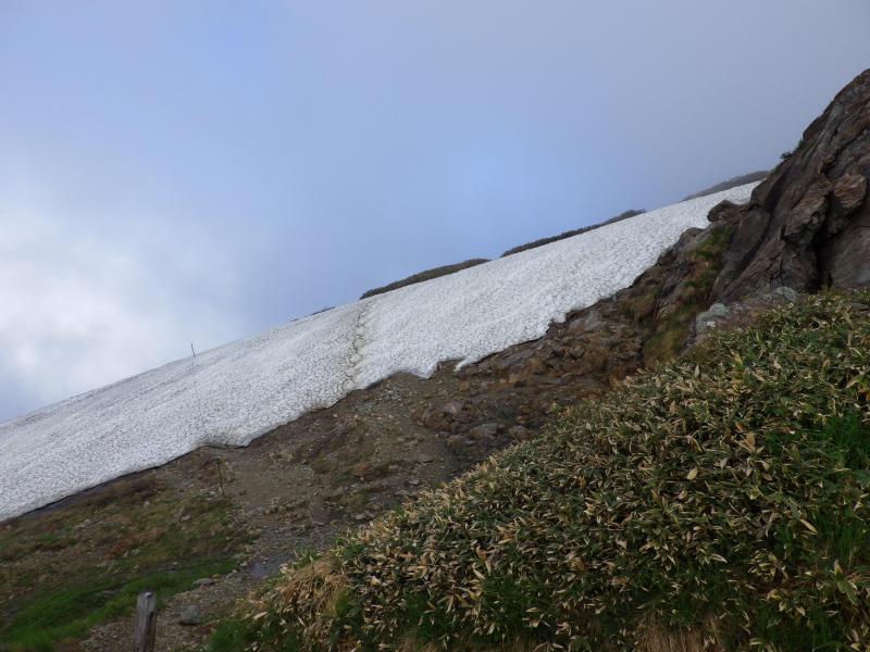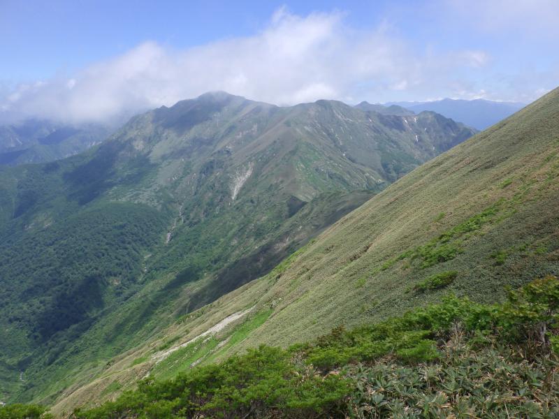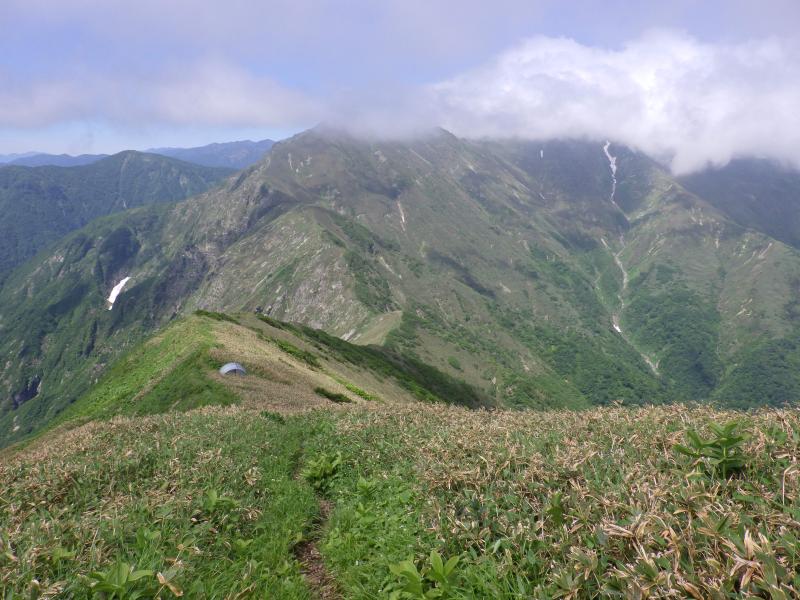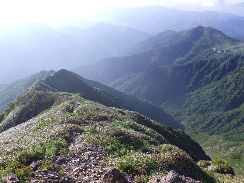 ⑬万太郎山からしばらくヤセ尾根が続き、笹原の尾根をトラバースし、その先に避難小屋