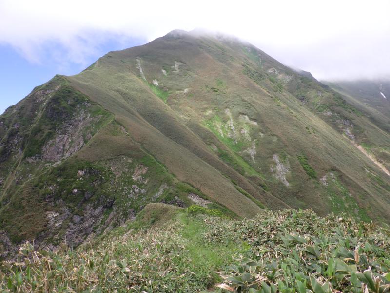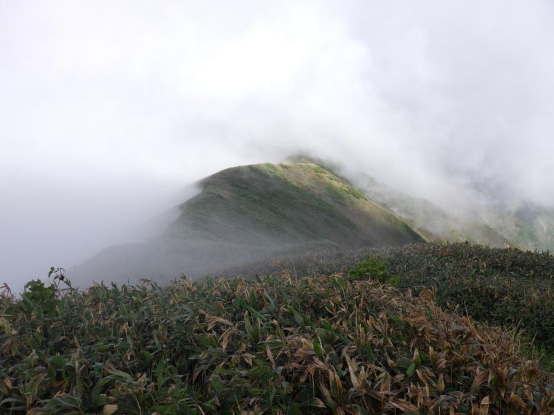 肩の小屋で6:30着、14時のバスには厳しいですが、16時のバスには充分な気がしてきました。肩の小屋周辺はハクサンイチゲのお花畑が広がりますが、ここは強風で花の撮影どころではありません。この先、ガスの稜線で先の登山道が見渡せませず、登ったり下ったりして、濡れた笹原を万太郎山まで進みます。万太郎山からはエスケープで土樽に下れますが、まだ9時と充分に時間がありますので、もちろん進みますが、正面に見え隠れする大きな山が仙ノ倉山なんだろうろと思うとまだまだ長いのが実感できます。
