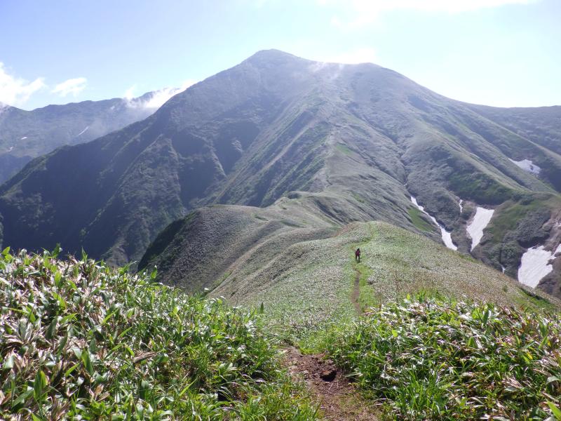 この万太郎山~仙ノ倉山の間にあるエビス大黒ノ頭前後が一番苦しい行程差で本日の核心でした。このピークは遠くから見るとなかなかいい形をしていますが、それだけしんどいということです。この区間で逆方向から来た登山客とすれ違いますが、逆方向も辛そうな感じです。途中の避難小屋でこの先はお花畑で天国のような道で登山客も多いですよと言われて、少し元気が出ます。仙ノ倉山手前では確かに斜面いっぱいに白いハクサンイチゲが咲き誇っていました。仙の倉山まで来ると、突然、登山客が増えて、やはりこの山まで往復する人が多いのだと実感します。ここで12時過ぎ、疲れた体を癒すべく、大休止。