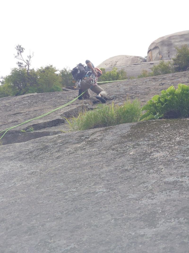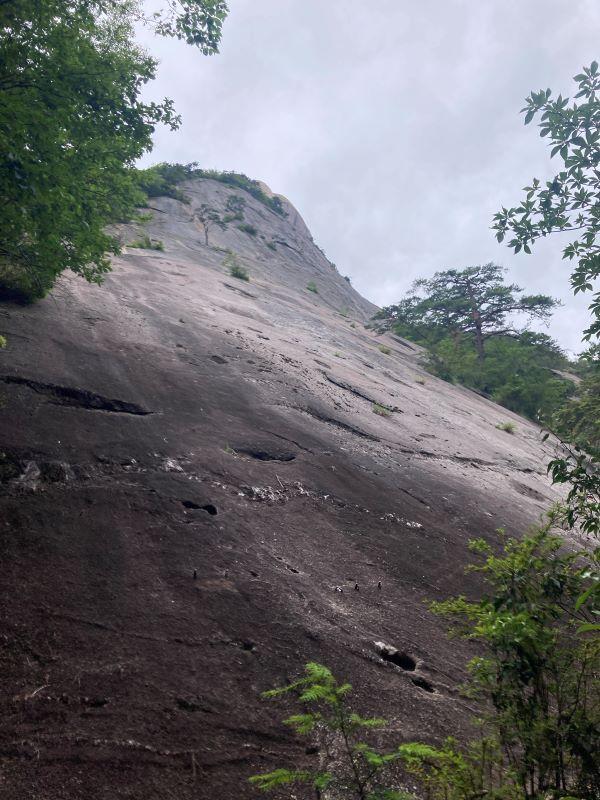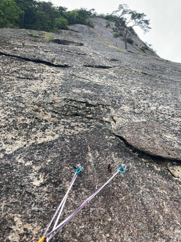出だし数mがかなり厳しく、体感は5.11a~bくらい。後半はボルトがなくなり、フレークにカムを突っ込んでプロテクションを取った。