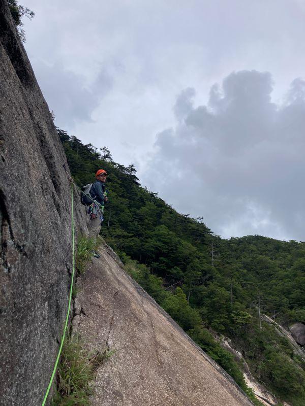 中間支点3本。ランナウトはするが傾斜は緩く慎重に登れば問題ない。