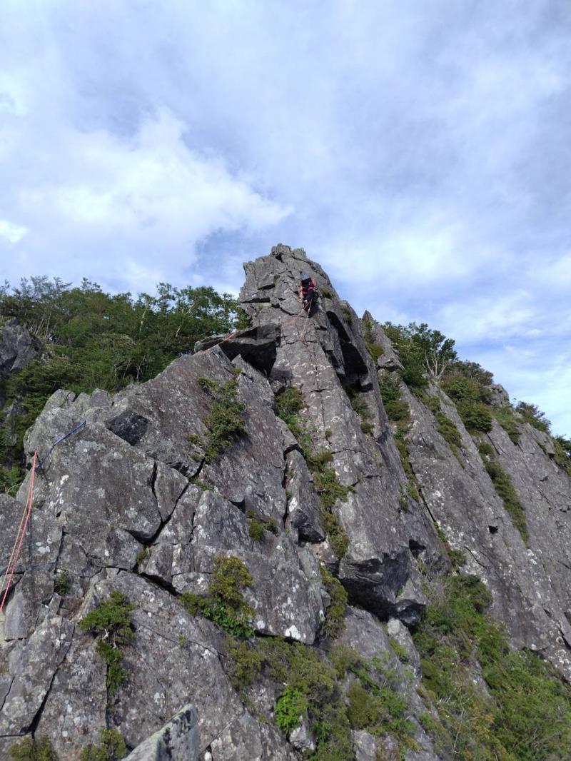 旗立岩は1P目が核心といわれ、切れ落ちたカンテからのハング越えや、明確な終了点がないので慣れていないと戸惑います。当然私も右のカンテに躊躇して左に逃げてしまいました。落ち着いて良く見ると、カンテ上にボルトが打たれていたのでトポ通り右に抜けるしかないと随分時間が経ってから悟りました。慎重にスタンスを探して足を決め、ガバに手を伸ばしてようやく切り抜け中間を取りました。その後は若干過剰気味に支点を取りなんとかハング越え。支点に出来そうなピナクルがあり、安定した場所だったのでここでピッチを切ることにしました。支点はピナクルの他にカムを2つ。カム1つだと不安だったので2つ取って3点で確保、ビレイ解除のコールまで間が随分開きました。その間先輩は立ったまま寝そうになったとか。