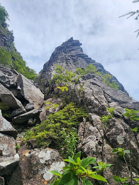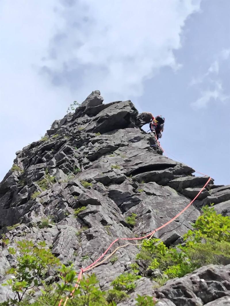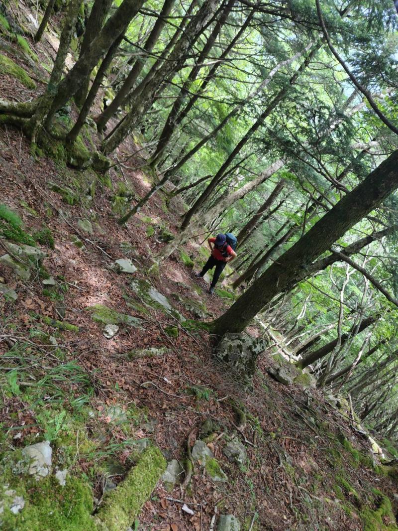 取り付くには山頂付近から2回の懸垂下降をして行くのが一般的のようですが、歩いて行けるならその方が手っ取り早いと判断し、今回は道なき道を這い上がりました。安定した登山道を逸れて不安定な斜面に取りつき、木や枝に掴まりながら、時には僅かな草や地面をプッシュして登ります。蒸し暑さと付きまとう蝿に耐えながら、集中力を切らさないよう必死でした。