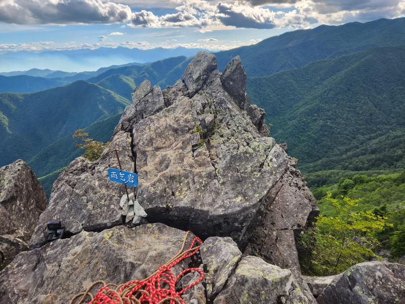 乾徳山は数年前に一度登りましたが、その当時はマルチのルートがあるとはつゆ知らず。山頂直下には鎖場があり、北アルプスなどの岩稜トレーニングにはもってこいの場所です。ただやはり暑さのせいか、この日登っていたのは他に2組だけでした。