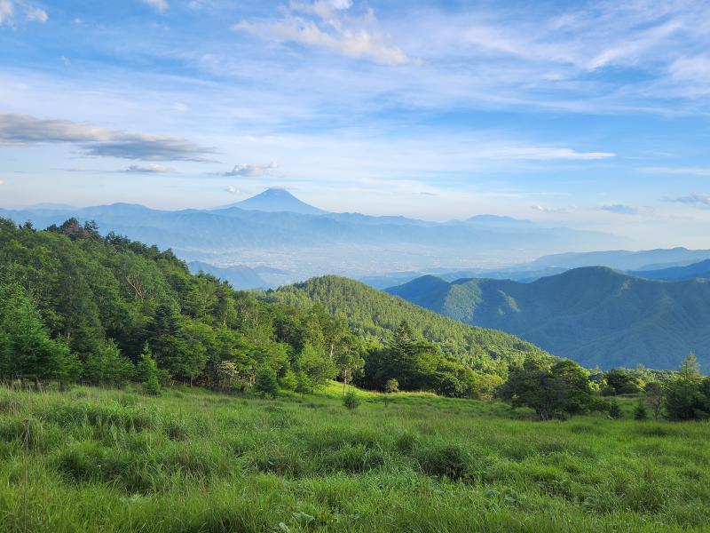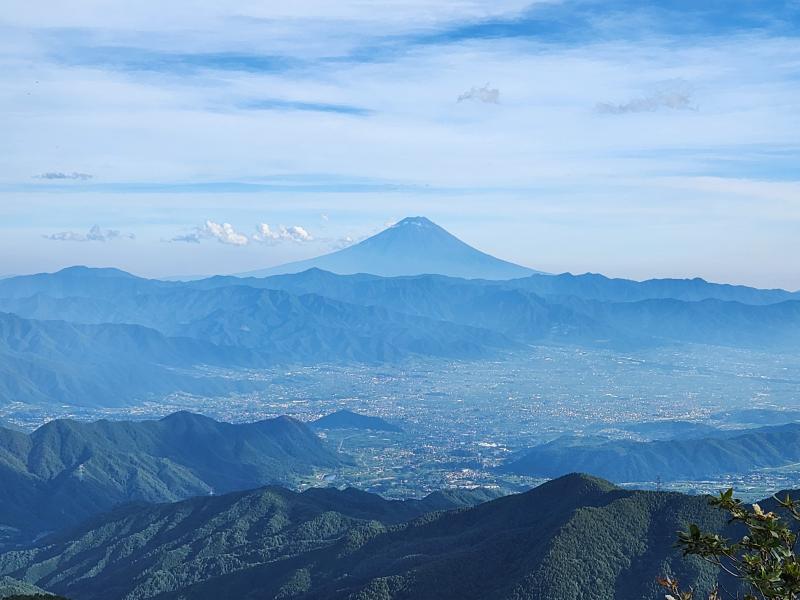 その横には北岳はじめ、南アルプスの峰々。北岳や甲斐駒は特徴的なのでわかりやすいですが、他は教えてもらわないと判別できません。先輩は山梨百名山を踏破しているので、端から端まで細かく山の名前を言い当てていました。私が登ったことのない荒川三山や難関の笊ケ岳も見えていたそうです。