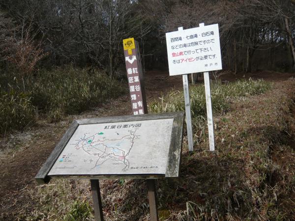 - 東おたふく登山口バス停<45>東おたふく山頂<20>本庄橋分岐<70>六甲山山頂<45>極楽茶屋跡<35>百間滝<5>似位滝<30>七曲滝<50>六甲山有馬ロープウェイ有馬駅.
