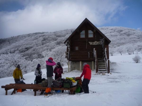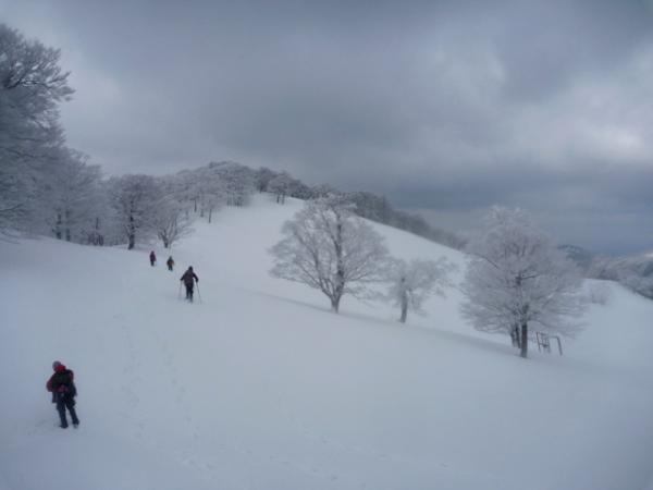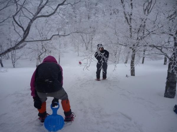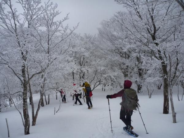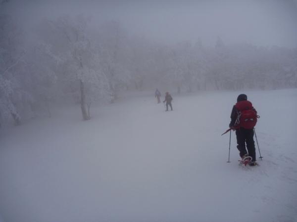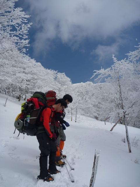 明神平に上がっても、雪は固めで、スノーシューやワカンでも歩けますが、