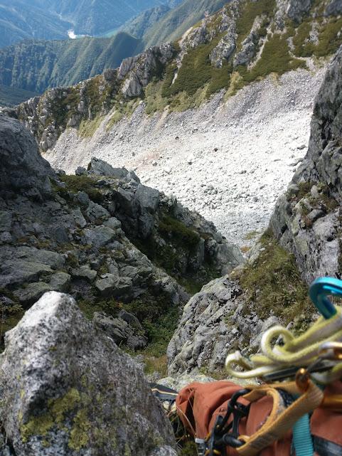 - 龍王岳南壁は 山頂下部まで登り薬師までの縦走路を下り ガレ場をトラバースして取りつきます。雷鳥沢から荷物デポ含め4時間かかりました。
