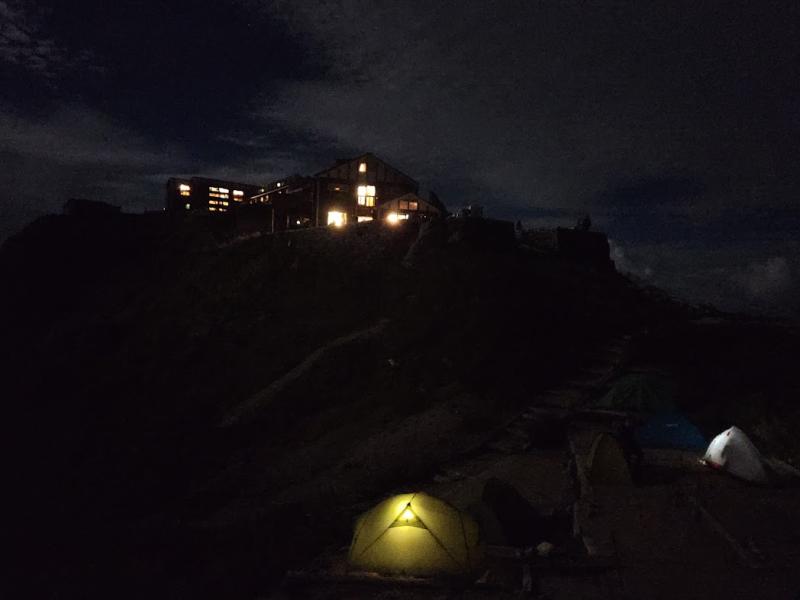 餓鬼岳小屋の前に小さなテン場があったので、先に荷物を下ろして小屋へ向かいます。安曇野の夜景が見えそうな右端側に陣取りました。受付を済ませてゆっくりお昼ご飯を食べながらこれからの計画を練っていると、ポツポツと嫌な音が。餓鬼岳登頂後に元気があればその先の唐沢岳まで...なんてプランを考えていたところでした。電波が入ったので天気を確かめると、少し待てば止みそうだったのでしばしの待機。しかし雨は弱くなっと思えば急に強くなり安定しません。小降りの時にフライの張りを強くして戻ると更なる大雨が。唐沢岳はもう諦め、餓鬼岳周辺をゆっくり散歩しようと計画を立て直し、やかんに火をかけました。お茶を飲んでいると、テントの外で慌てて駆けて行く人の足音がしました。可哀想にと思いながら、地図や撮った写真を眺めたり、雨雲レーダーと睨めっこしたり、なんやかんやしていたらいつの間にか暗くなり、今度は夕食の準備をすることに。雨は止まないし、もうすっかり根が生えたのでさらに寝る支度に取りかかりました。すると今度は稲光と雷鳴が轟く始末。沢の増水が気になるところでしたがそのまま寝入ってしまいました。