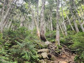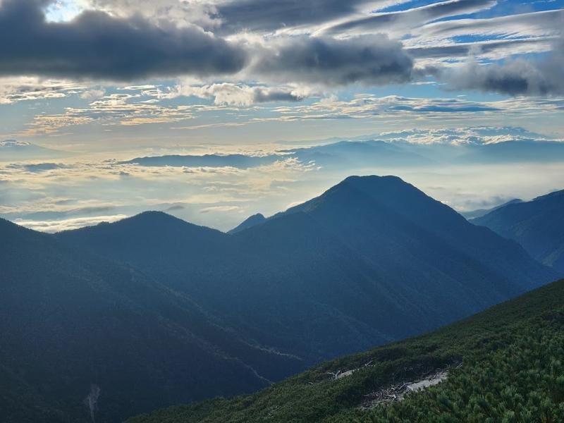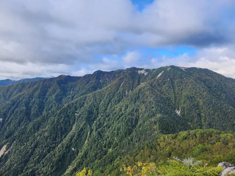 東沢乗越は沢沿いなだけに、このまま下山してしまうのではと心配になるほどの距離を下りました。その後は稜線に出るまでひたすら登り返し。笹の海を這い上がったので全身朝露でびっしょりしました。稜線からはこれから向かう餓鬼岳、唐沢岳、さらには高瀬ダムから続く裏銀座の山々が見えてとても爽快でした。表銀座のようにこのまま気持ちの良い稜線歩き、とはいかず再び樹林帯を下っていきます。人気の無い理由はこのアップダウンでしょうか。