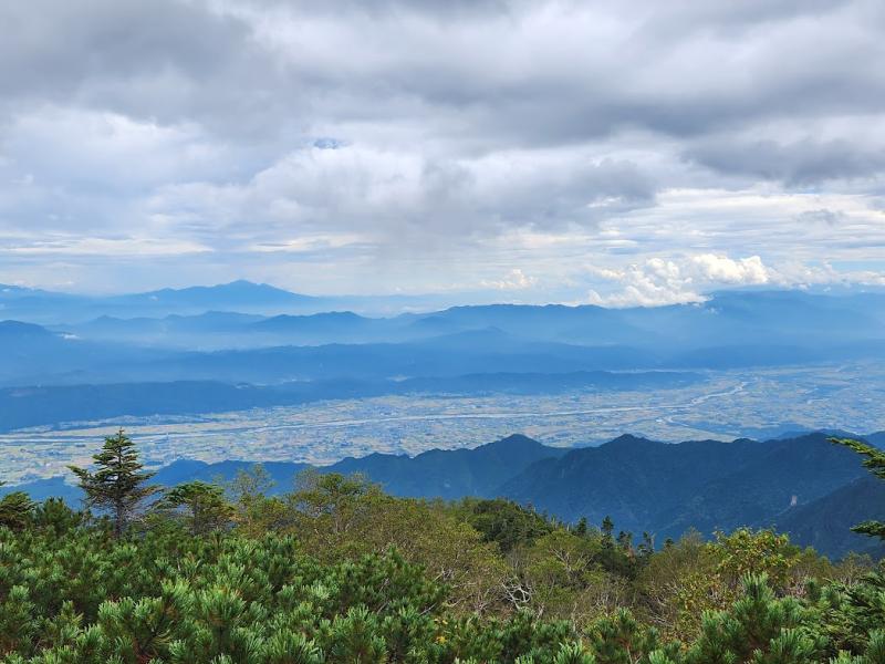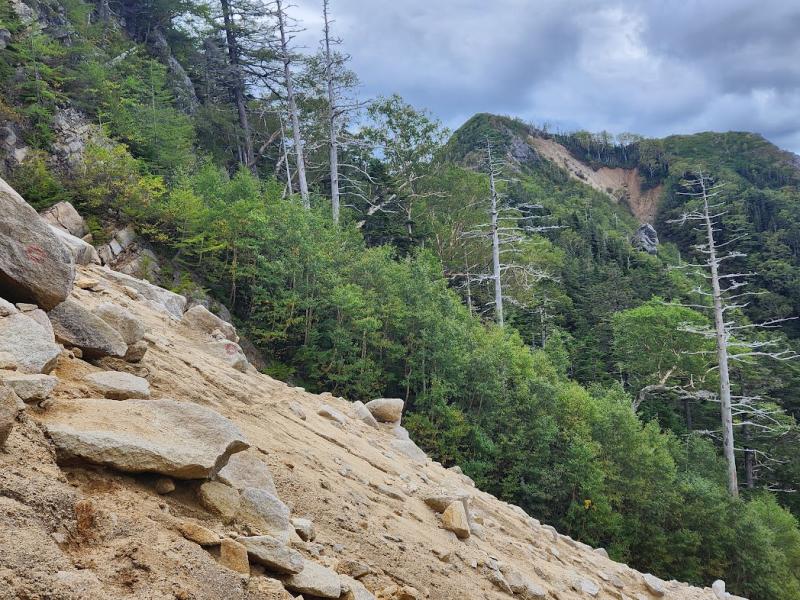 餓鬼岳方面へ縦走する人はほとんどいませんがこの日は単独の男性が歩いていました。聞けばこのまま東沢から下降するか、餓鬼岳まで行って白沢を下りるか悩んでいました。私は当初合戦尾根ではなく破線の東沢から登る計画を立てましたが、餓鬼岳小屋にテン場予約をした際、東沢は崩壊して危険なので変更するよう促されました。その話を伝えると、その方はまた悩み始めたので私は先を急ぎました。