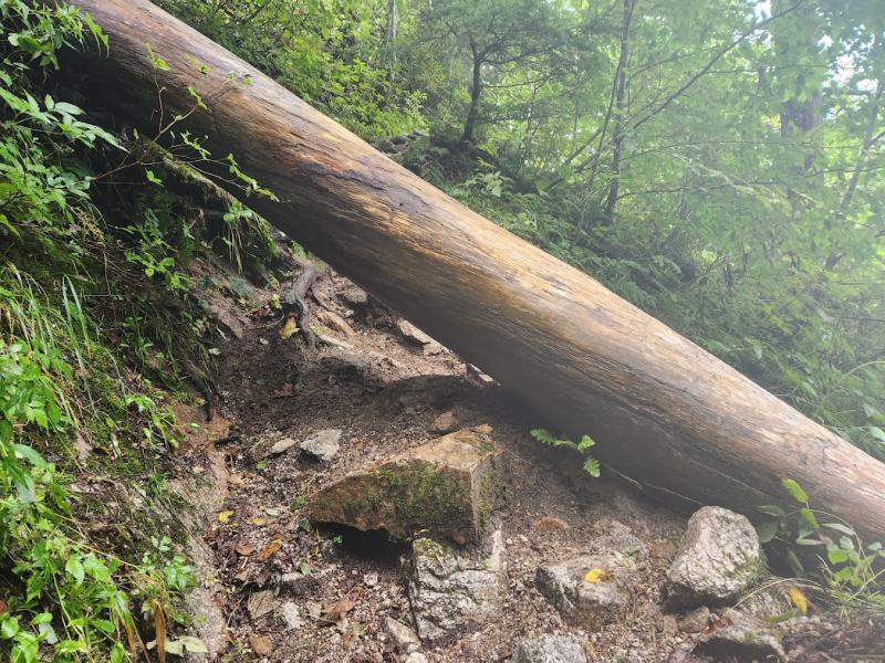 白沢までの道は楽ではないとわかっていましたが想像以上の難路でした。前半は木の根や倒木が行く手を邪魔して歩き辛く、岩場は急なので落石を起こしがちです。しかも雨。適度に休憩を入れて沢下りに備えました。