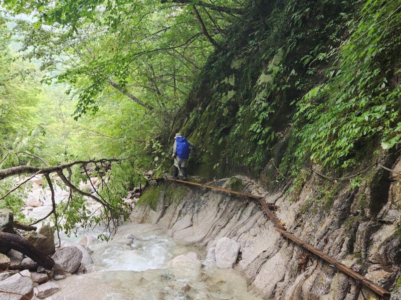 最後に断崖に作られた桟道を渡ります。写真で見ていた限り細くて怖そうな印象でしたが、手すりも付いていて案外安定していました。