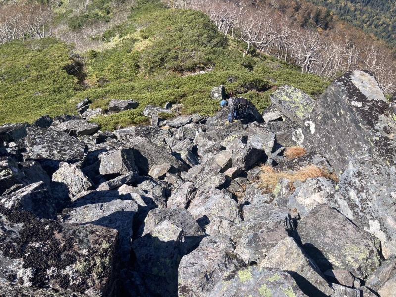 途中、浮石の岩場や藪・ハイマツ漕ぎもあり、
