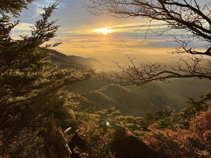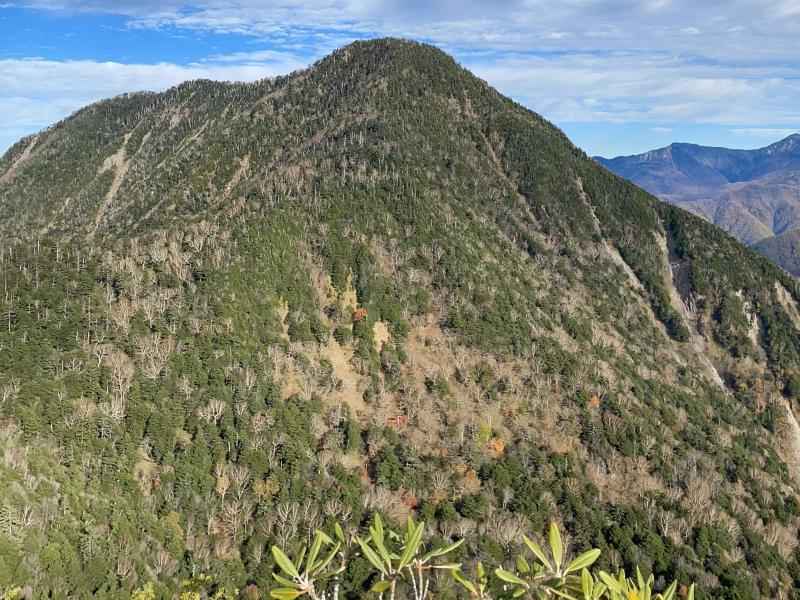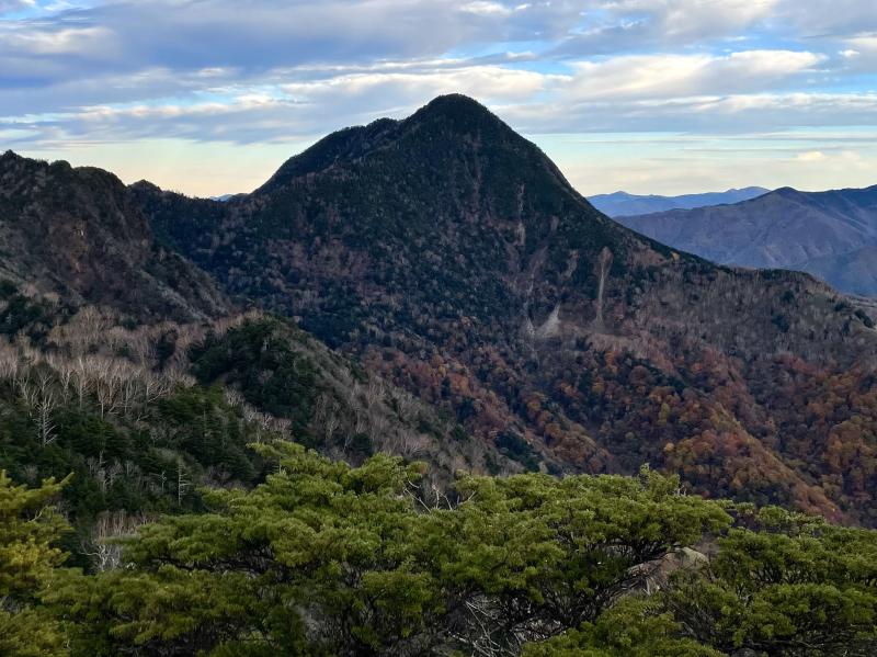 山と高原地図によるとコースタイムは約14時間、最後まで元気に歩けるかな…と、登る前は不安でいっぱいでしたが、登り終わって振り返ると、急峻な岩場や藪漕ぎは楽しく、うってかわって穏やかな樹林帯は紅葉がきれいで、さまざまな変化に富んだとても面白い山でした。